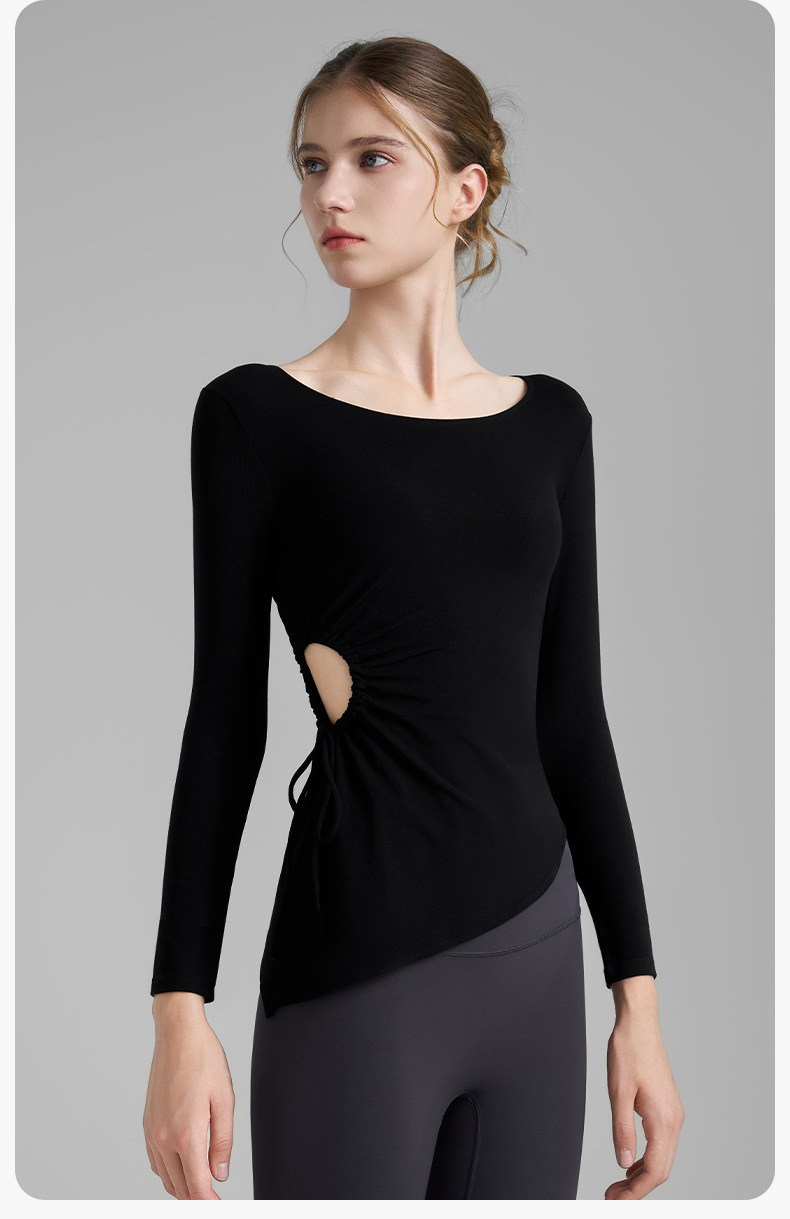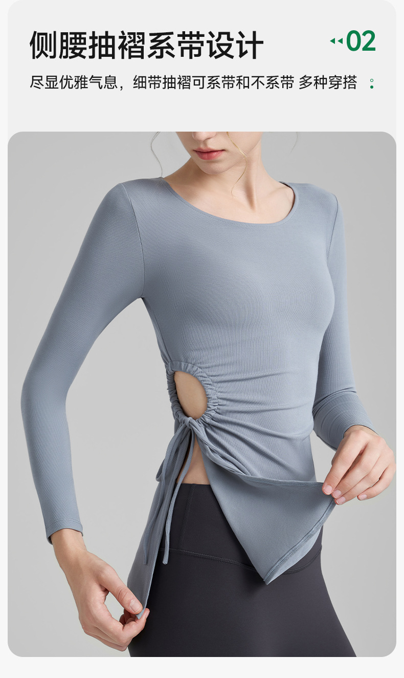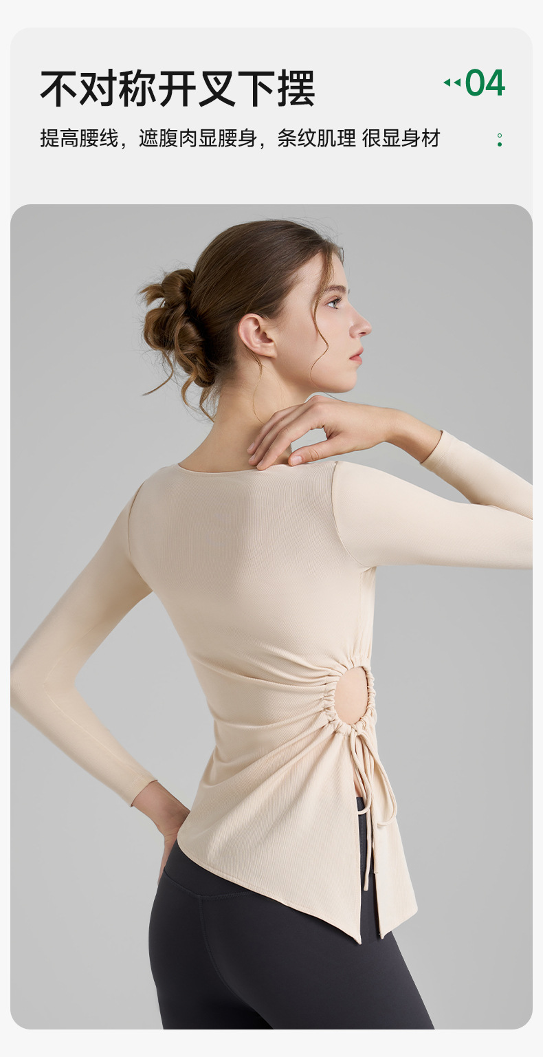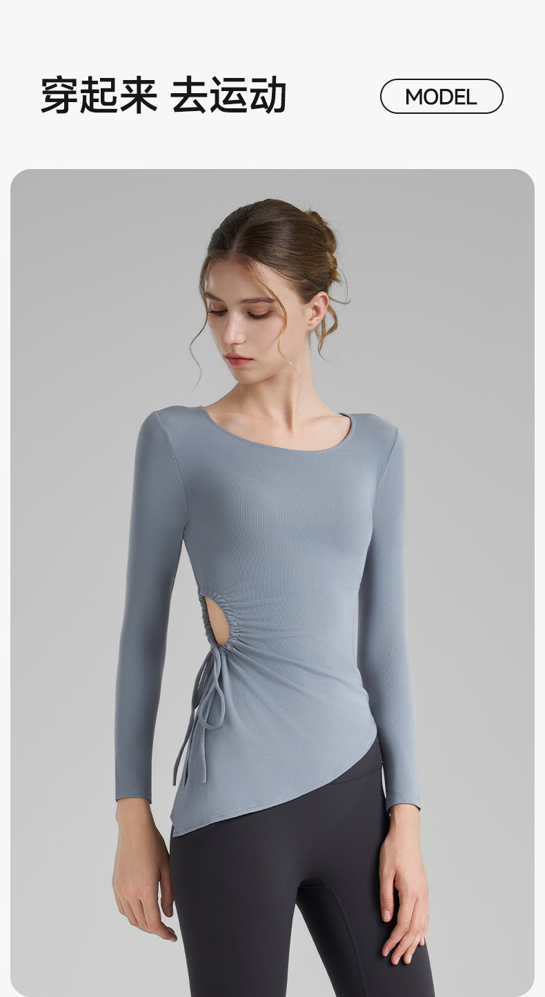 누드톤 고탄력 요가 티셔츠 여성용 고급 가을 신상 요가복 긴팔 조임끈 허리 트임 피트니스복스토어 가기