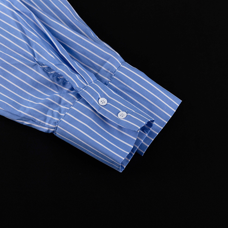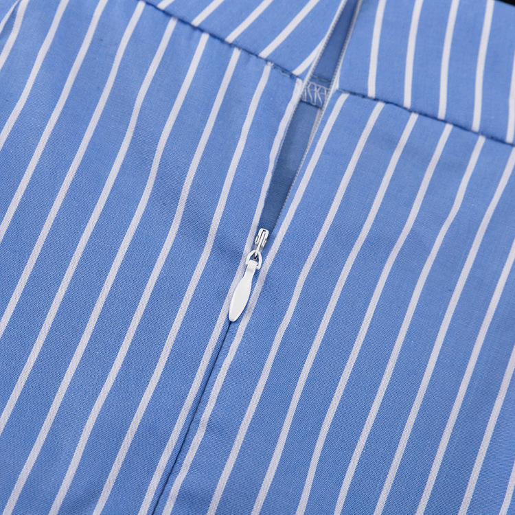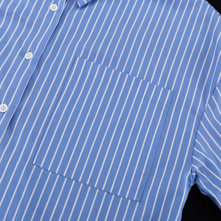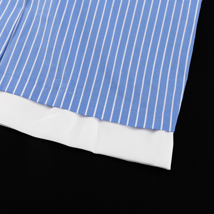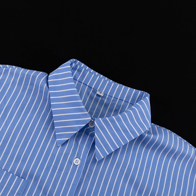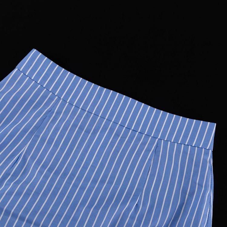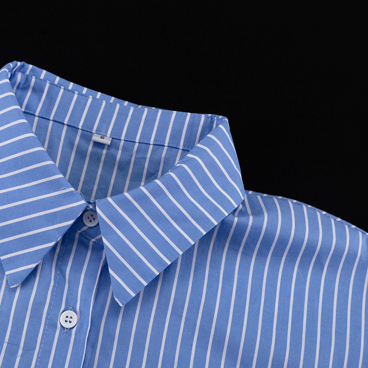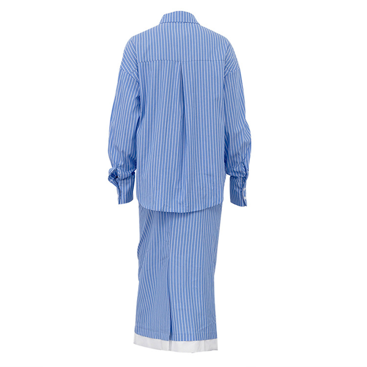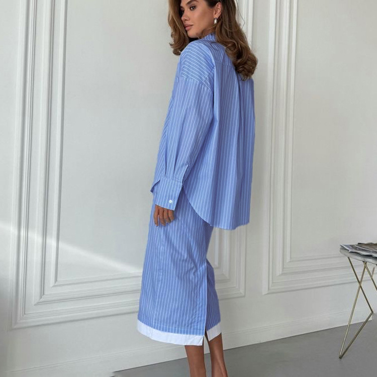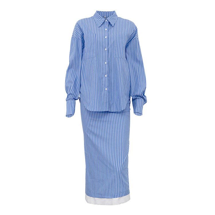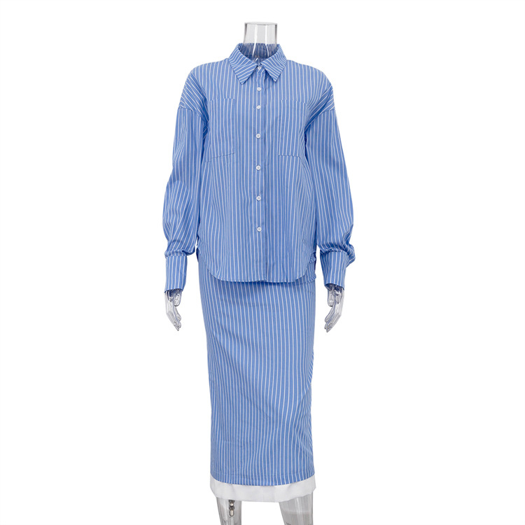 유럽과 미국 여성의 스트라이프 대비 컬러 스커트 정장 여성 라펠 긴팔 포켓 셔츠 하이 웨이스트 힙 스커트 투피스 세트