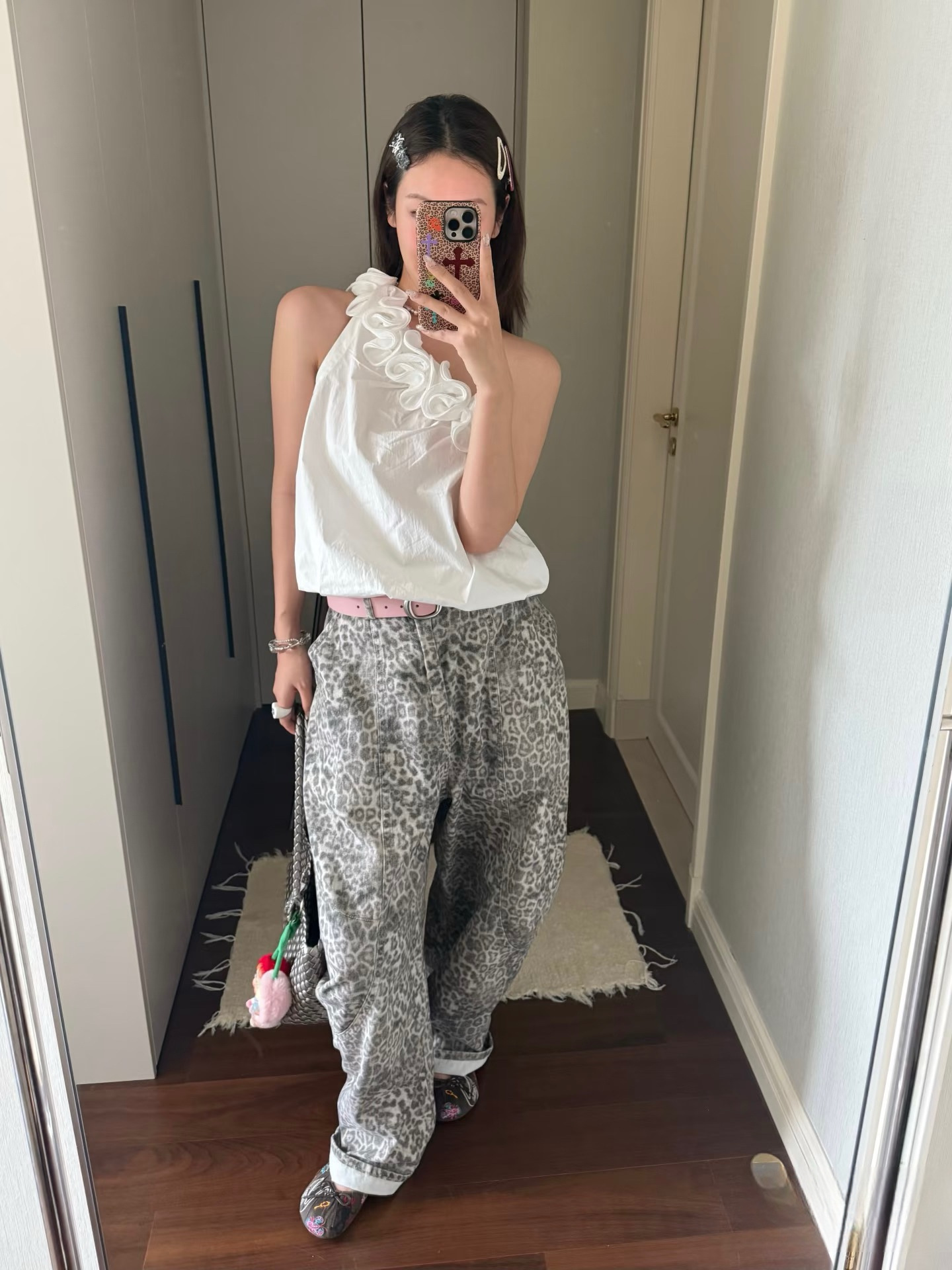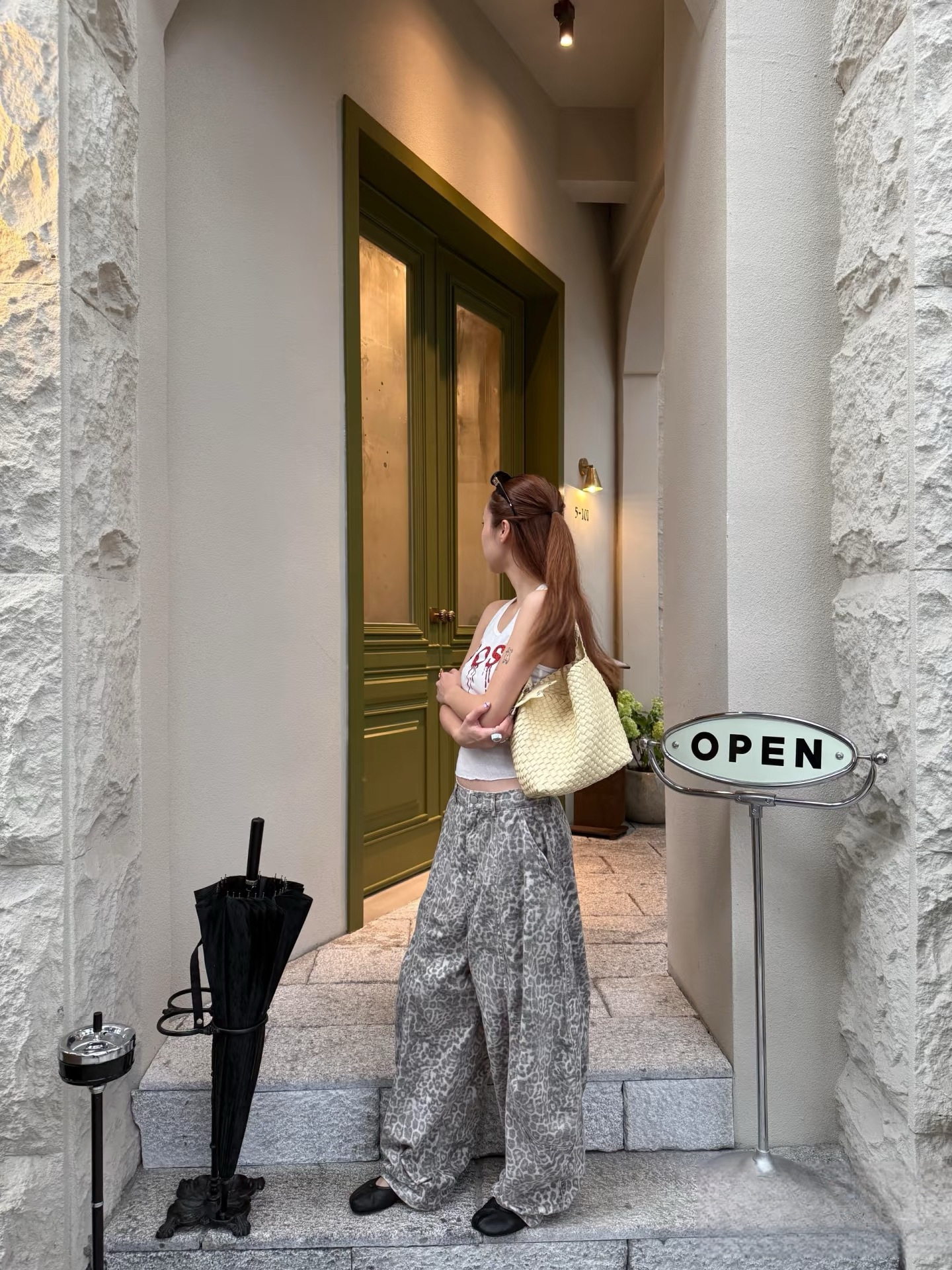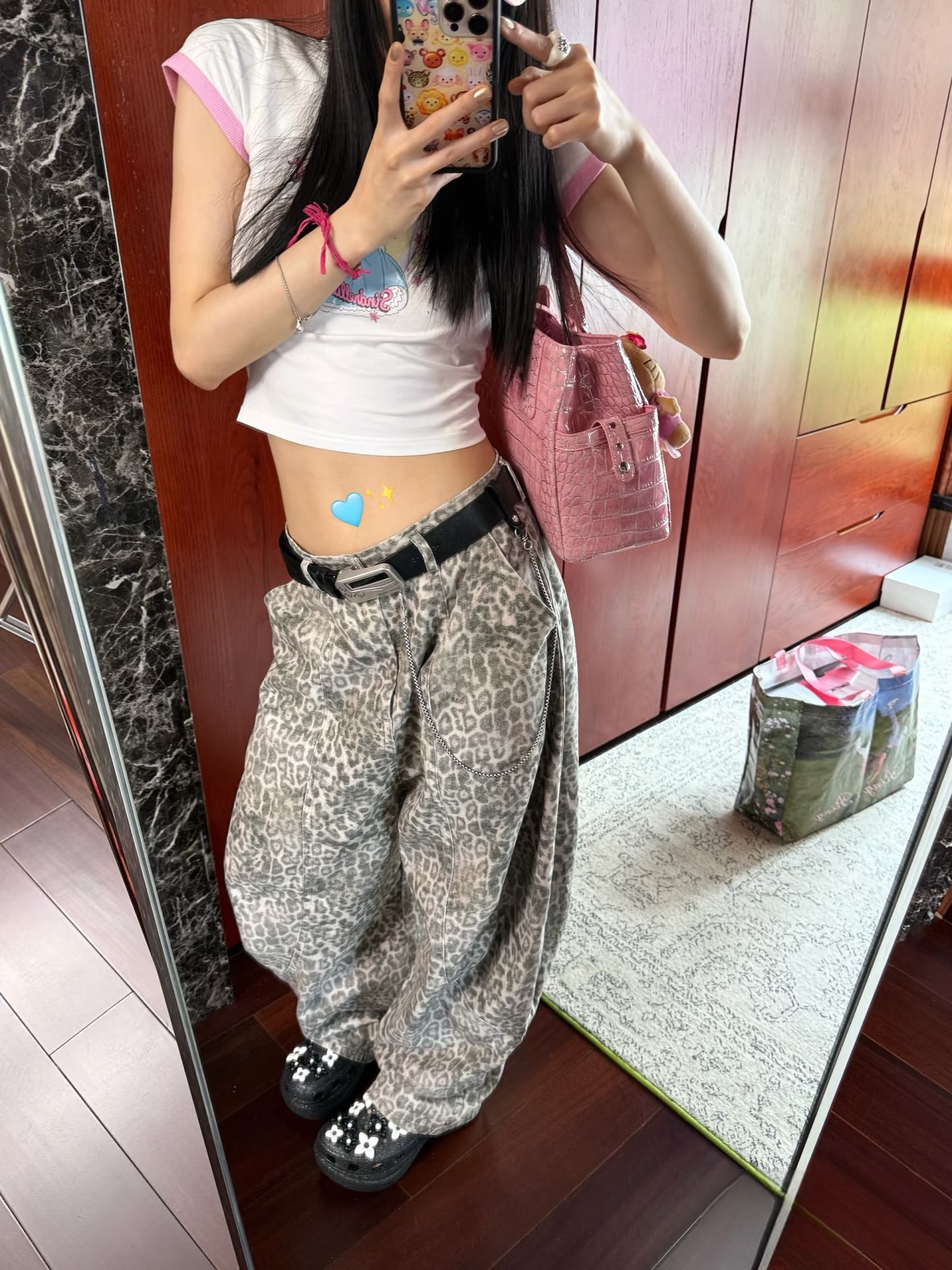 여성용 레트로 디스트레스드 다용도 실루엣 워싱 레오파드 프린트 청바지, 레이지하고 루즈한 패셔너블한 바닥 길이의 세이버 팬츠 5020스토어 가기