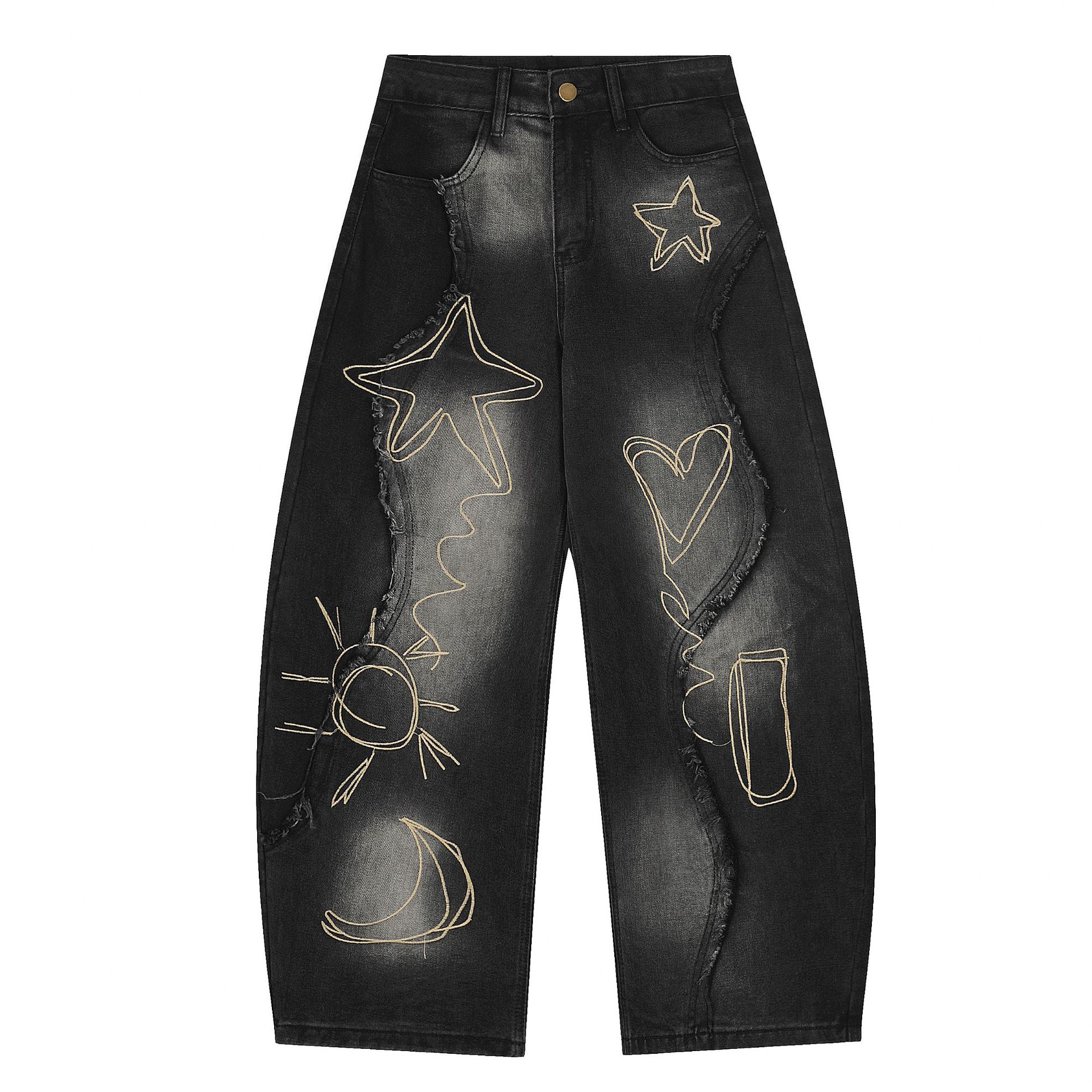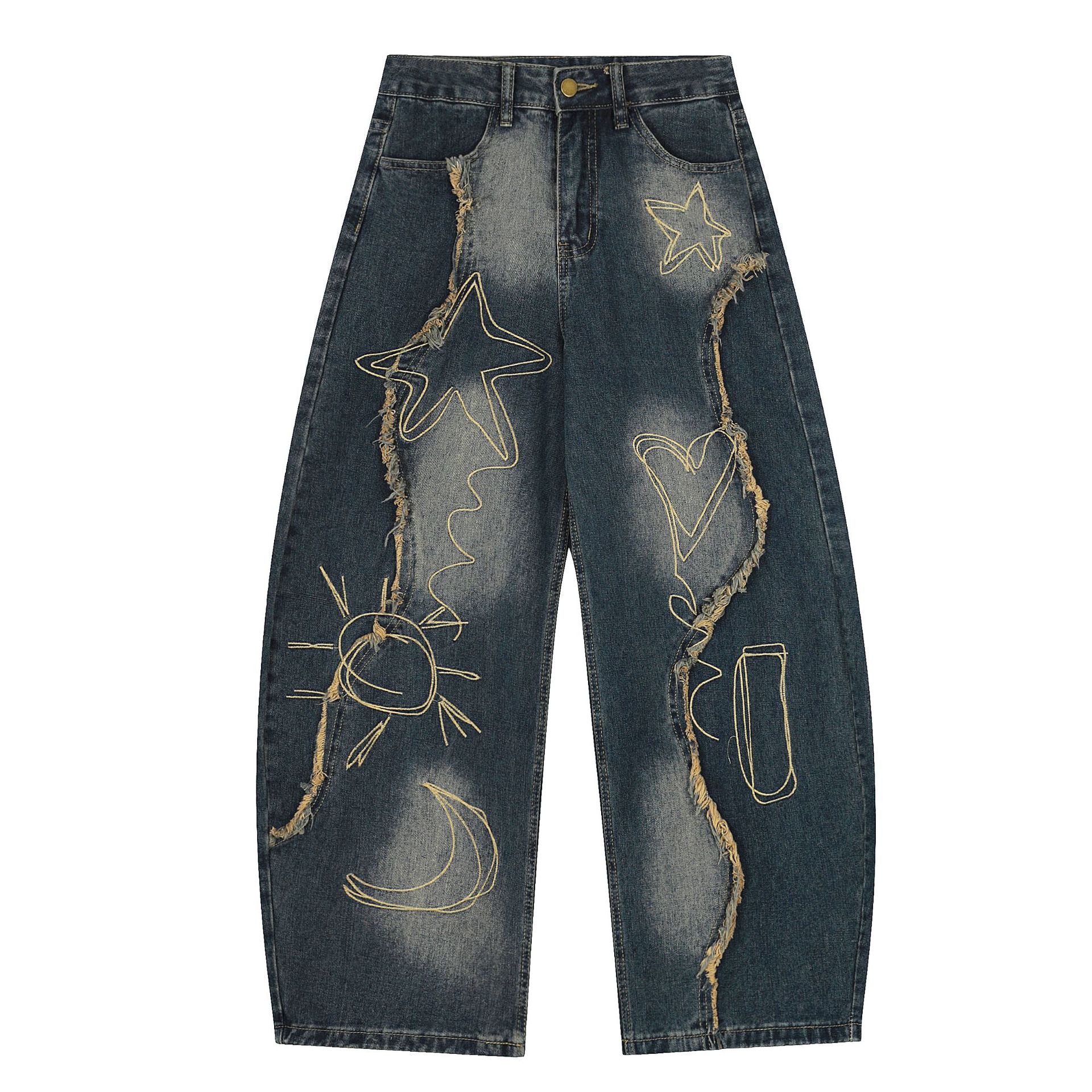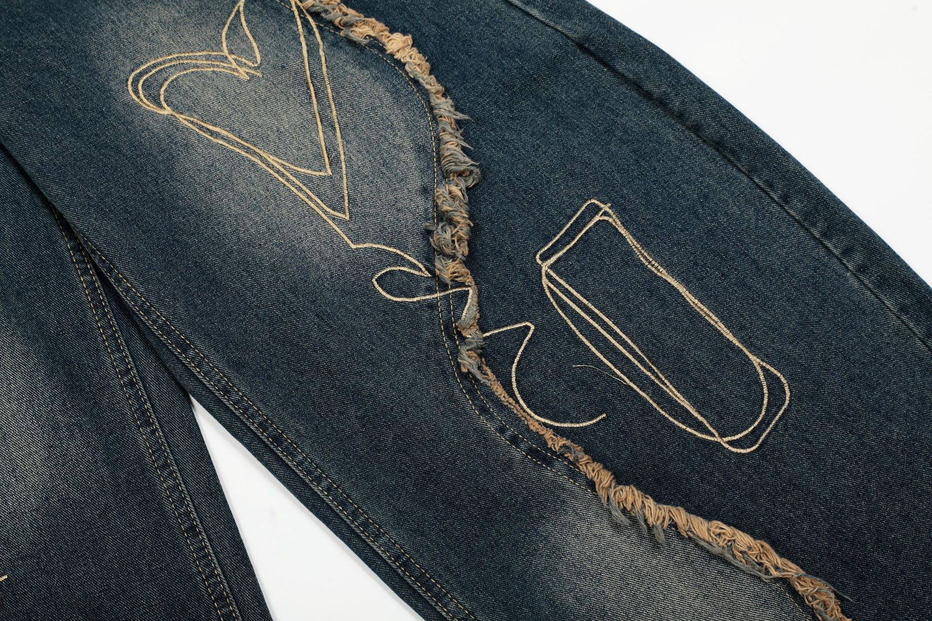 嘉衣库男装2025秋季美式复古刺绣水洗毛边牛仔裤男女弯刀阔腿长裤