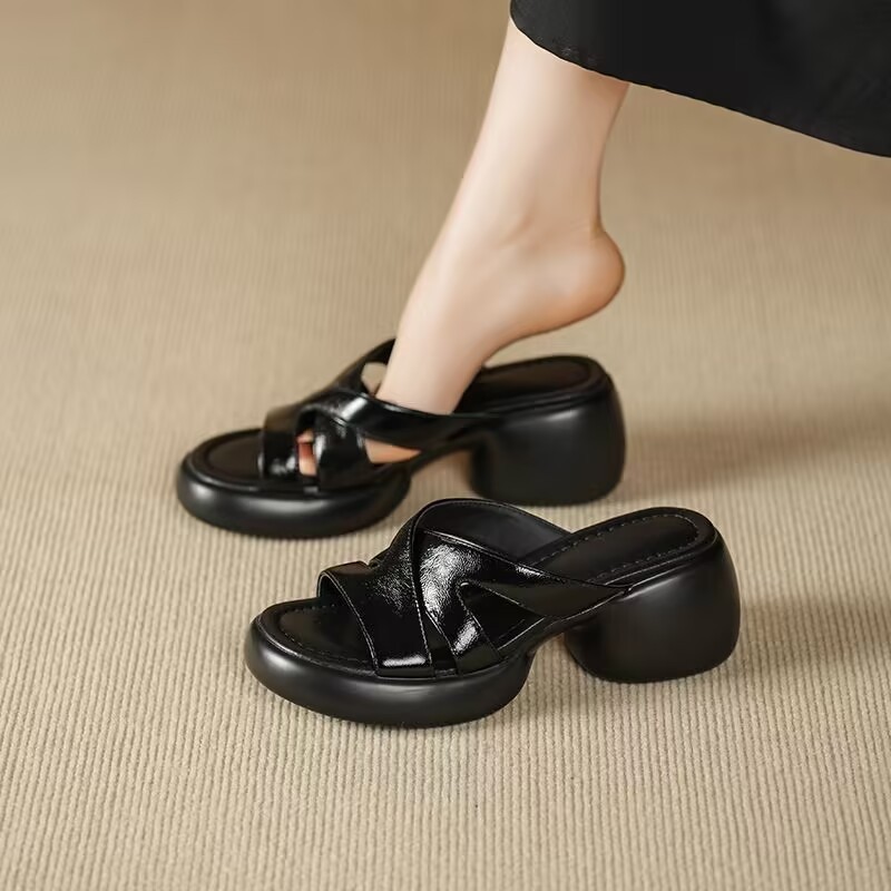 软底粗跟露趾凉拖鞋女2025夏季新款软皮配裙子厚底高跟罗马凉拖鞋스토어 가기