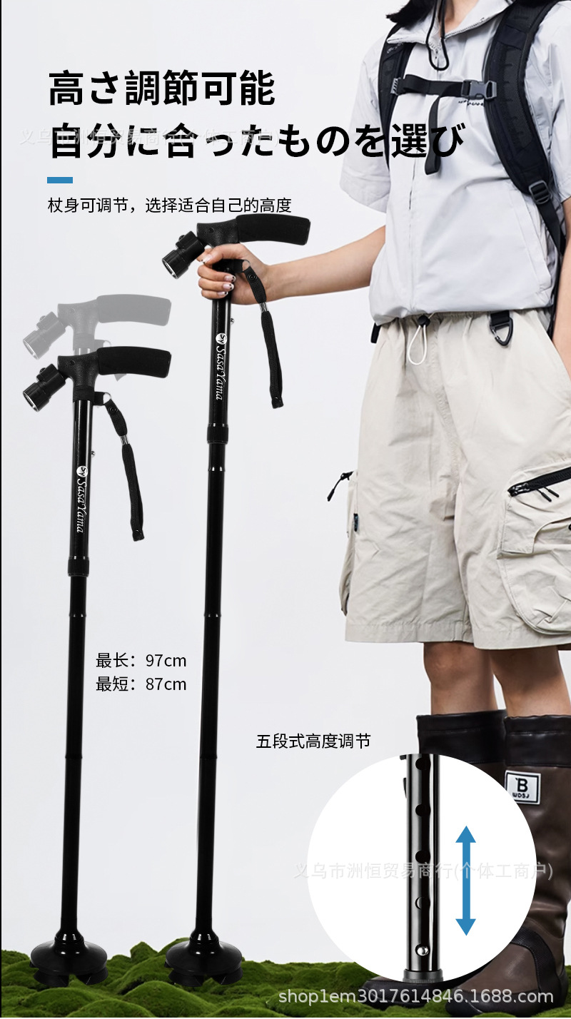 日本SASAYAMA四角拐杖高度可调老人手杖防滑可照明铝合金登山仗