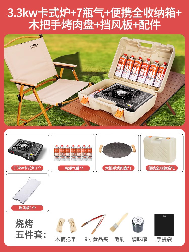 • 升级卡式炉+7瓶气+便携全收纳箱+木把手烤肉盘+挡风板+配件