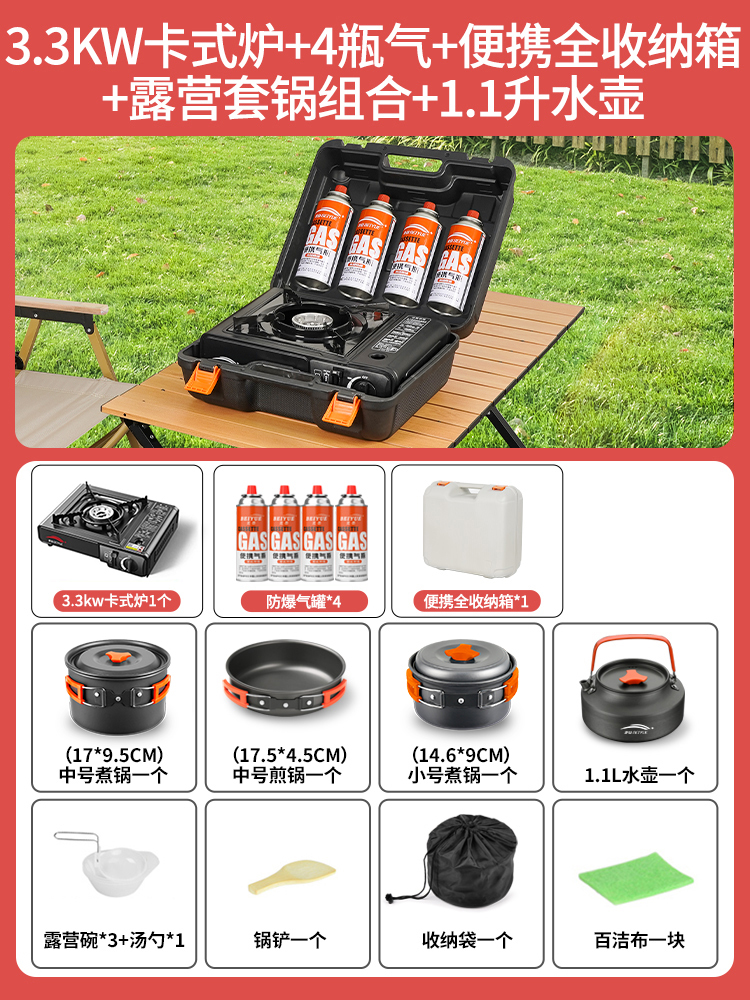 • 升级卡式炉+4瓶气+便携全收纳箱+露营套锅组合+1.1升水壶