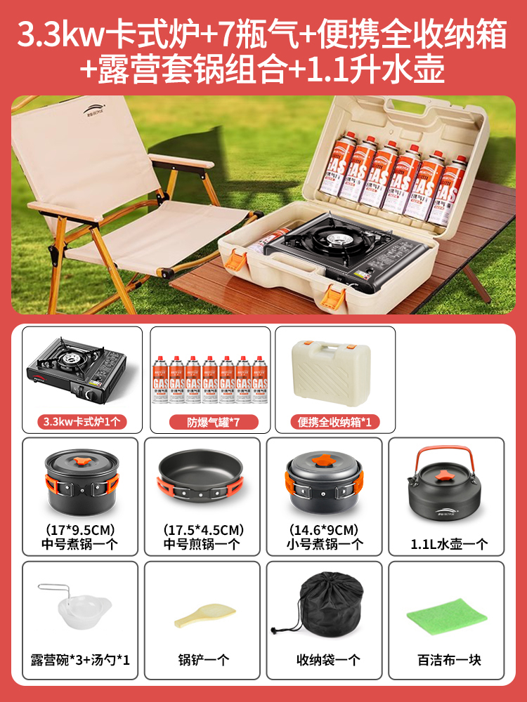 • 升级卡式炉+7瓶气+便携全收纳箱+露营套锅组合+1.1升水壶