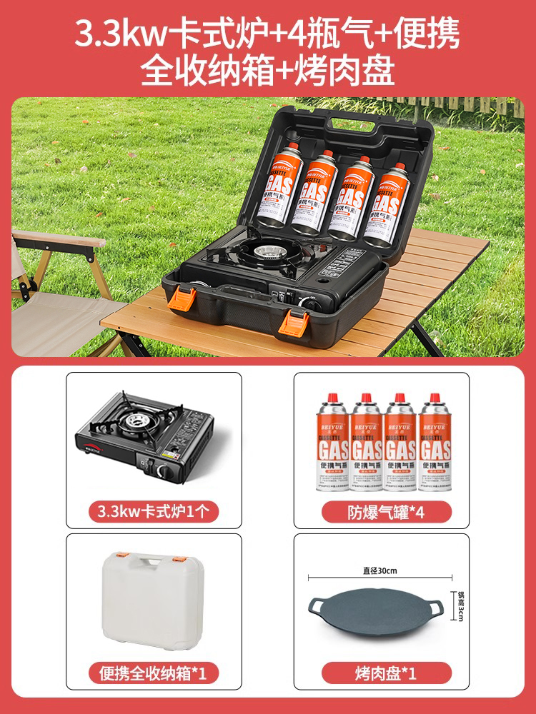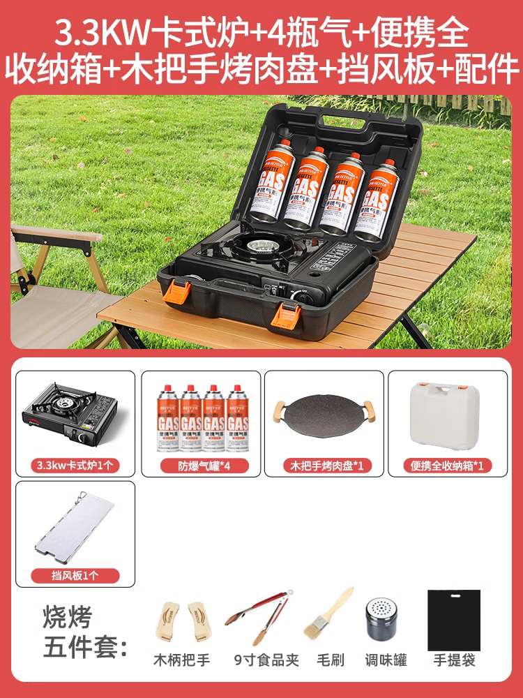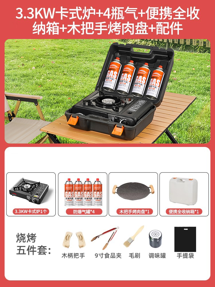 • 升级卡式炉+4瓶气+便携全收纳箱+木把手烤肉盘+配件