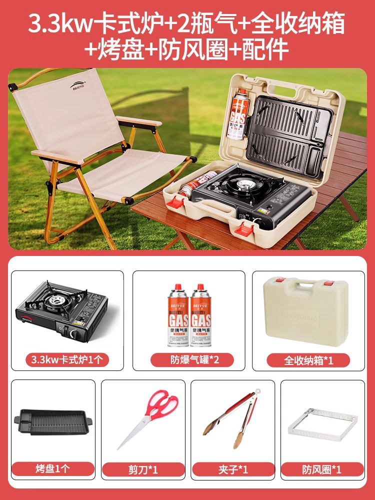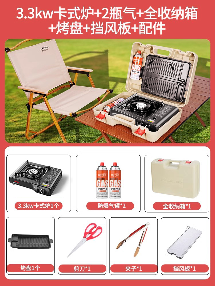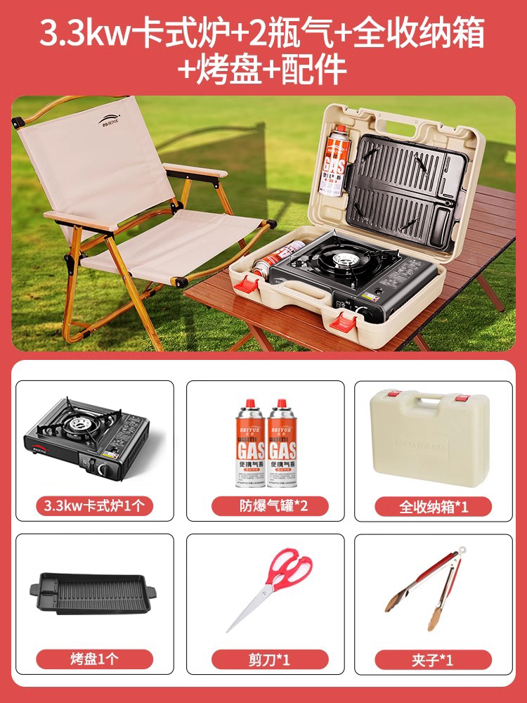 • 升级卡式炉+2瓶气+全收纳箱+烤盘+挡风板+配件