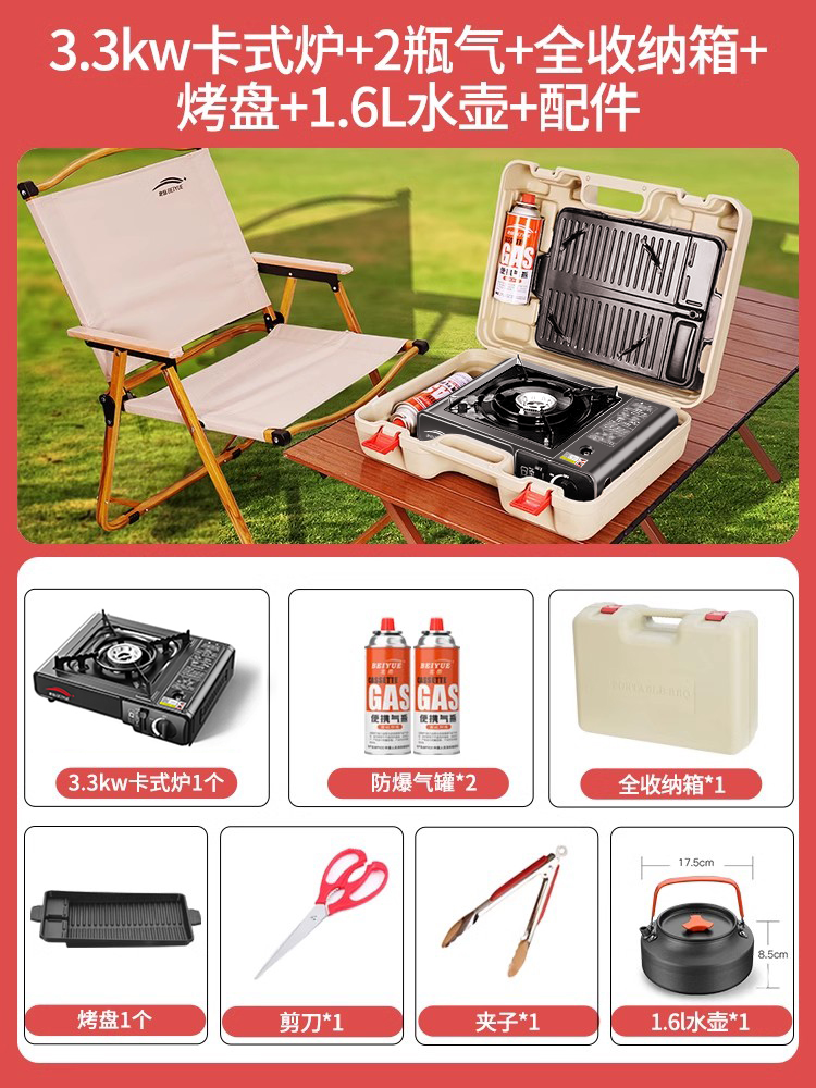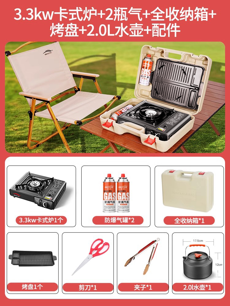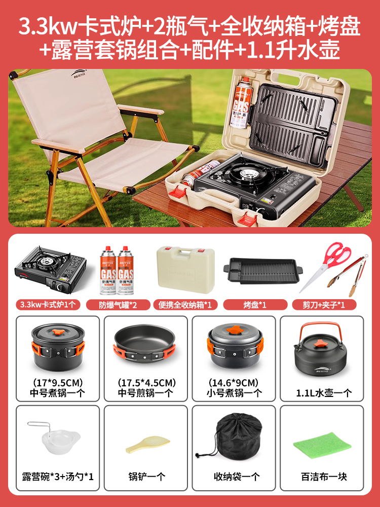 • 升级卡式炉+2瓶气+全收纳箱+烤盘+配件
