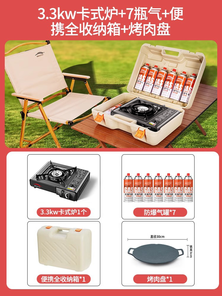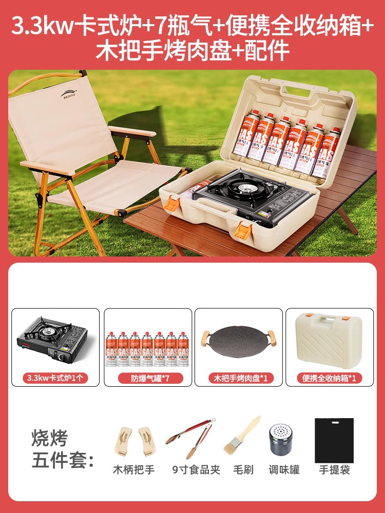• 升级卡式炉+7瓶气+便携全收纳箱+木把手烤肉盘+配件