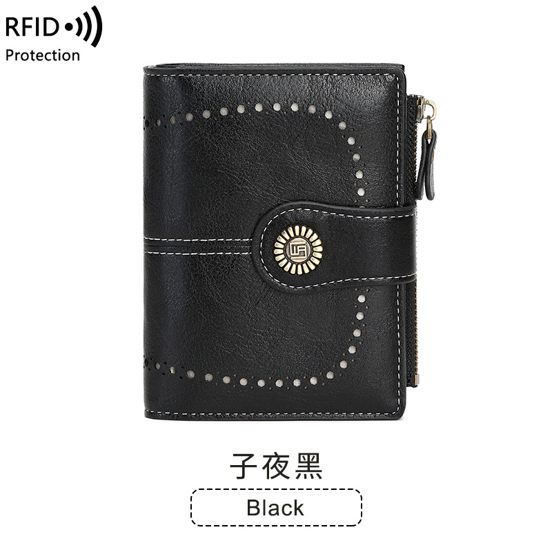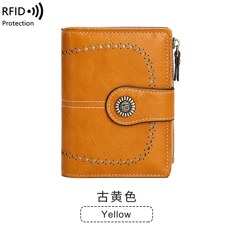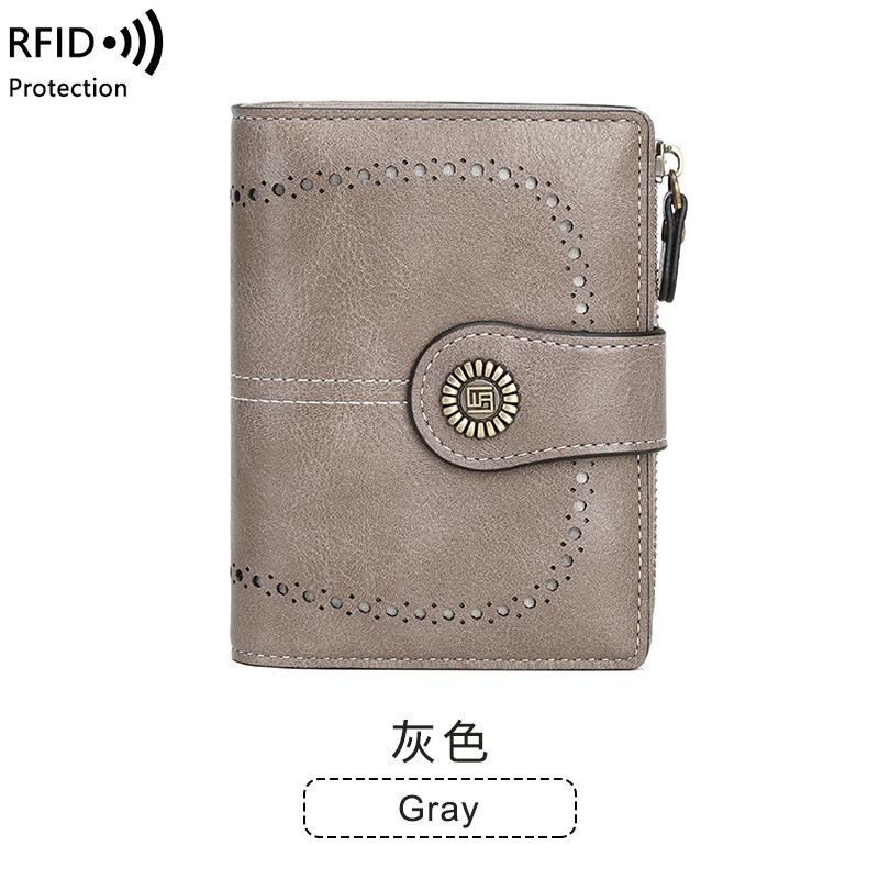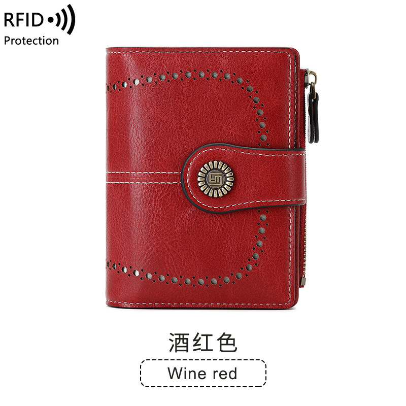 2023 새로운 RFID 숙녀 지갑 짧은 카드 가방 유럽과 미국 오일 왁스 가죽 변경 지갑 패션 버클 지퍼 지갑