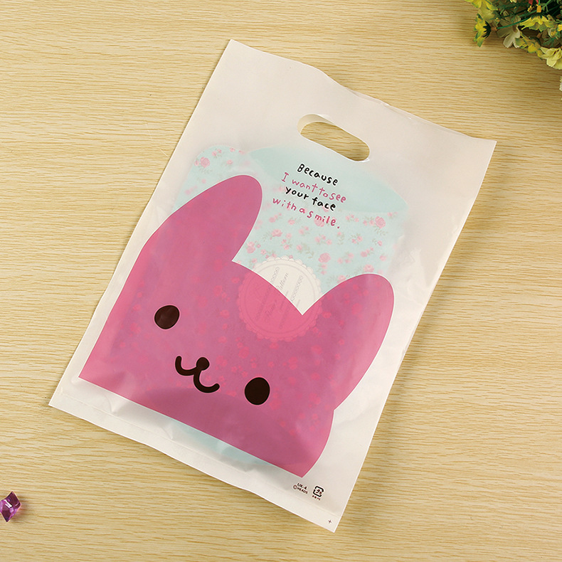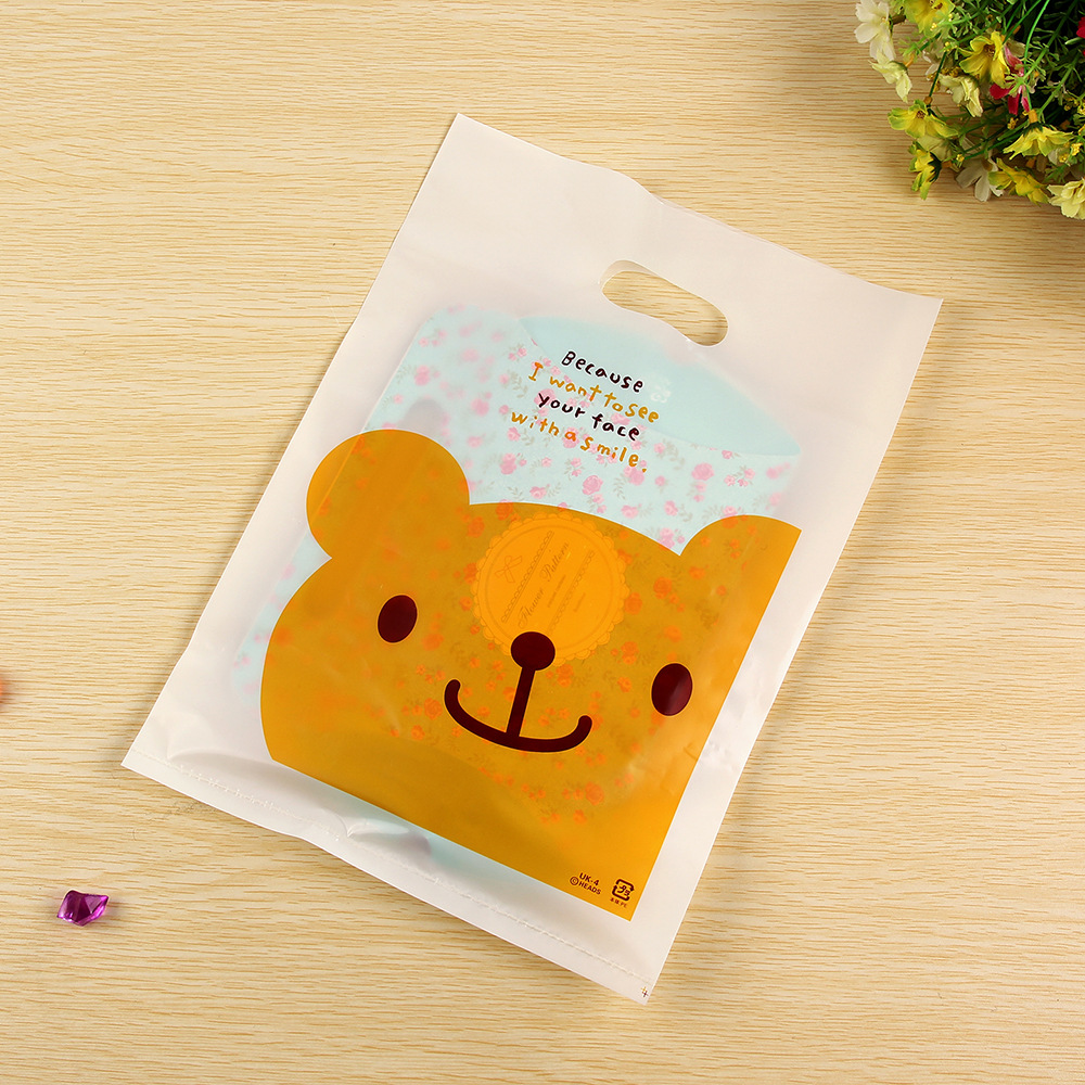 本系列塑料袋采用全新料的高压膜,跟市面上同样图案的廉价劣质塑料袋完全不同,单面可爱小熊笑脸,米白底色,另一面为空白,可加印LOGO,印刷费另计,采用高档环保油墨印刷,花纹清晰色彩明亮,无异味。全新料,光滑柔软,韧性更强,承重力更好。