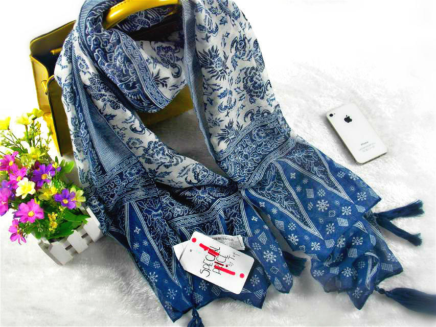 레트로 민족 스타일 파란색과 흰색 도자기 술 면화 및 린넨 스카프 대외 무역 문학 및 예술 우아한 여성용 대형 숄 스카프스토어 가기
