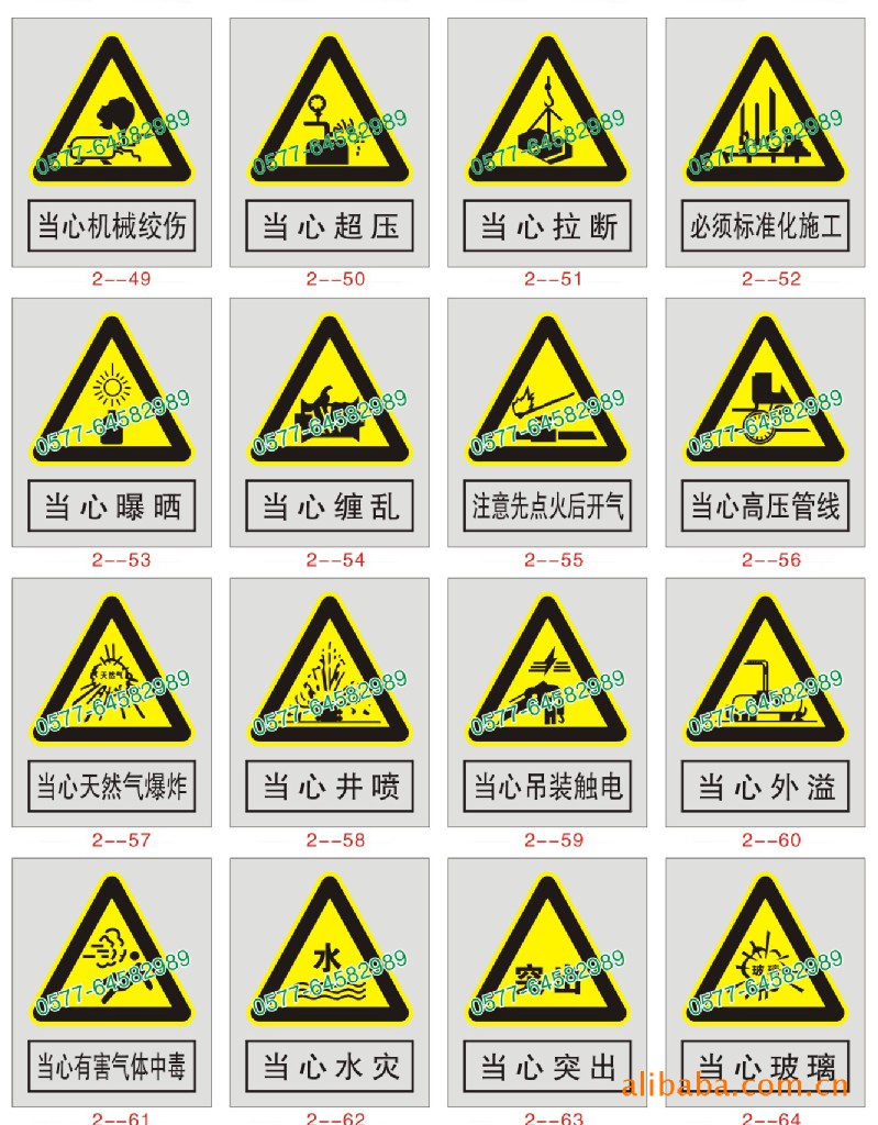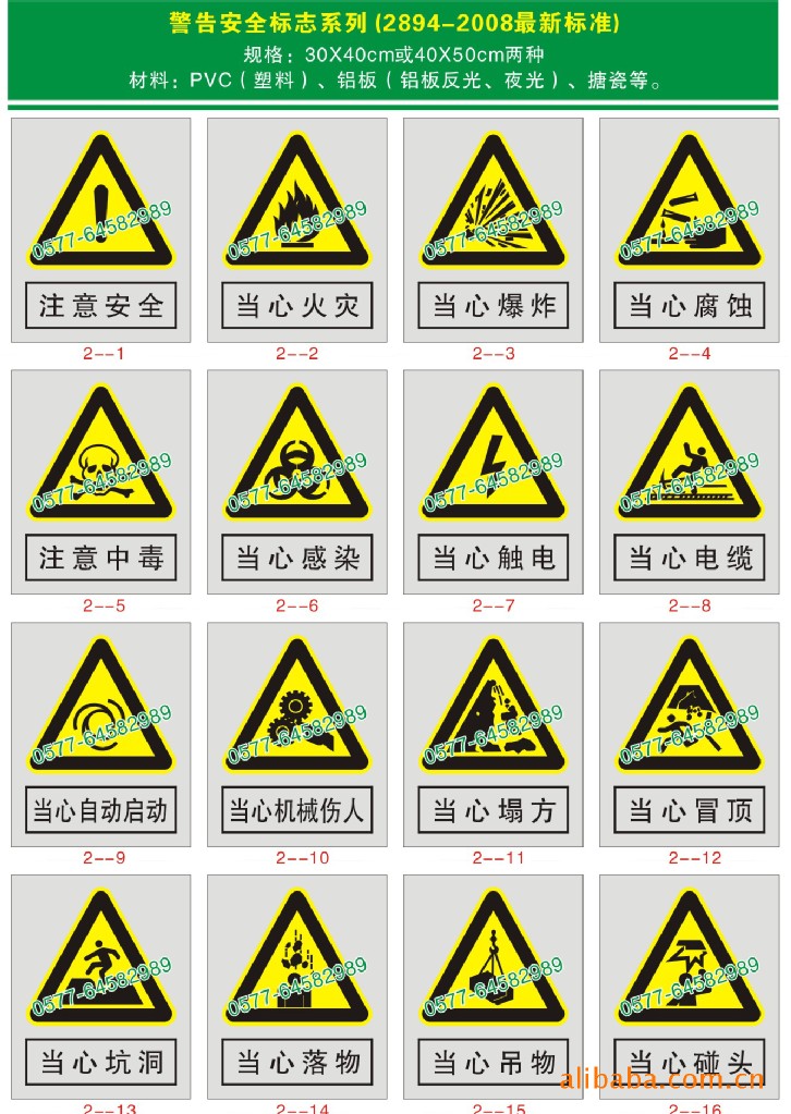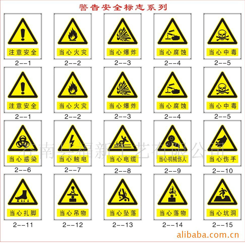 本公司专业生产安全标志、标志牌、交通标志、道路指示牌、门号牌、铭牌等标牌的企业。特按 新强制性国家标准GB2894-2008《安全标志》、B13495-92《I消防安全标志》GB14161-93《矿山安全标志》、GBZ158-2003《工作场所职业病危害警示标识》、GB13690-92《常用危险化学品标志》和《电力生产企业安全设施规范手册》(2001年修订版)生产安全标志牌,产品材料主要有塑料、铝质(包括铝质反光牌、铝质夜光牌)和搪瓷等几种。本产品耐酸咸、抗腐蚀,在野外经得起风吹雨打,设置在厂矿、电力设施、建筑工地等处,向人们提供禁止、警告、指令、提示、消防等信息。