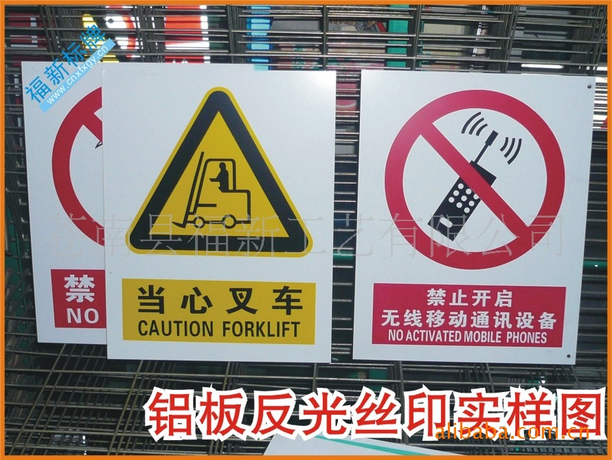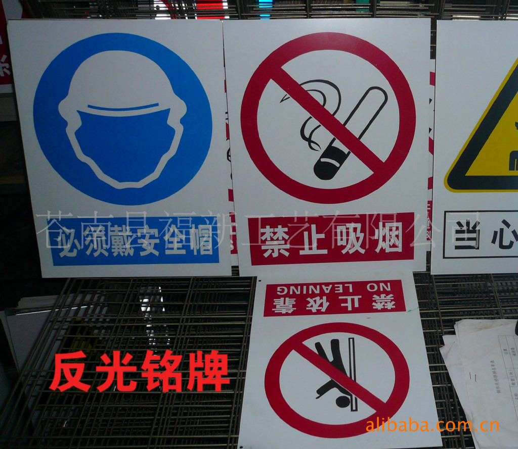 3、反光标志牌(材料有铝质反光、PVC反光、不锈钢反光):就是在各种材料的表面上贴反光膜再丝网印刷而成。在白天以其鲜艳的色彩起到明显的警示作用,在夜间或光线不足的情况下,其明亮的反光效果可以有效地增强人的识别能力,看清目标,引起警觉,为黑暗中的行人或夜间作业人员提供 有效、 可靠的安全保障,从而避免事故发生,减少人员伤亡,降低经济损失。本产品一般用于公路铁路的导向牌、指示牌,矿山机场安全牌,地名牌、车牌、电力等企业。