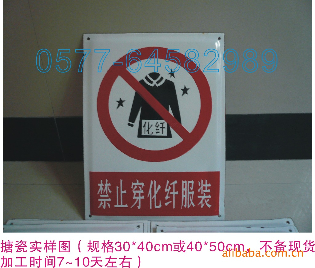2、搪瓷标志牌:指在0.8mm厚度的铁板表面涂搪瓷釉,再经高温烧制而成。本产品具有耐酸碱、耐热震、耐高温、抗冲击、在室外阳光照射不褪色,不含任何对人体有害的元素等特点,广泛应用于化工、电力和电信等腐蚀性强或须把标志牌悬挂于室外的企业。