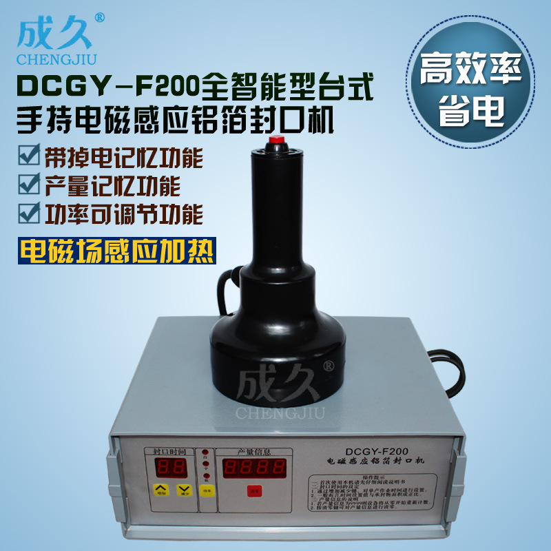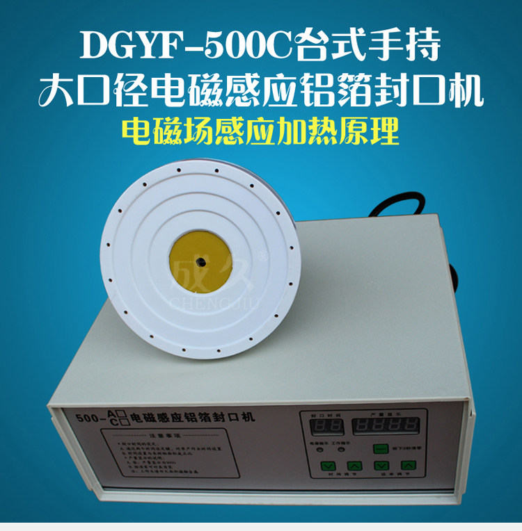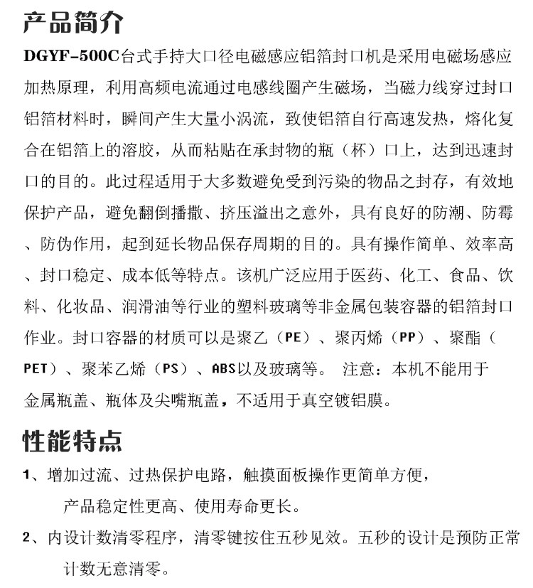 型号:DGYF-200/500A/500B/500C/500D/500E/500ZN/500L手持式电磁感应铝箔封口机是利用电磁感应的原理,将瓶口上的铝箔片瞬间产生高热,然后熔合在瓶口上,使其达到封口的功能,具有良好的防潮、防霉、防伪作用,起到延长物品保存周期的目的。适用于医药、农药、食品、化妆品、润滑油等行业理想包装设备、容器的材质可以是聚乙烯(PE)、聚丙聚(PP)、聚酯(PET)、聚苯乙烯(PS)、ABC以及玻璃等,不能用于金属瓶体及瓶盖。本机系一种非接触的封口机器,通过电磁感应瞬间产生高热,即铝箔溶合在瓶口上,此过程适用于大多数避免受到污染的物品之封存,有效地保护产品,避免翻到播撒、挤压溢出之意外。(本公司同时提供各种材料感应铝箔膜)。
