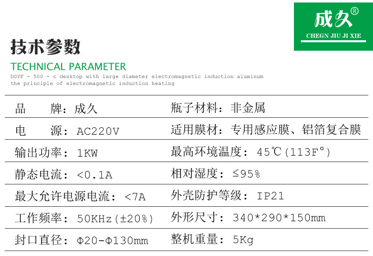 型号:DGYF-500D属于水平感应机型, 主要用于φ20-φ60 mm直径范围内带提手柄塑料壶(如机油壶)等普通瓶盖的封口作业。