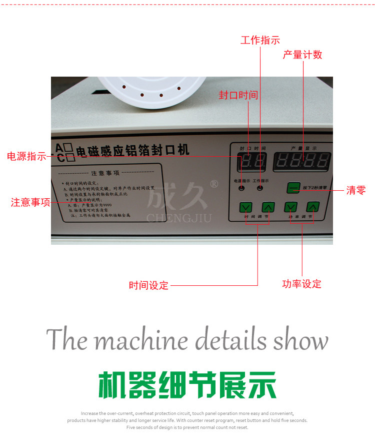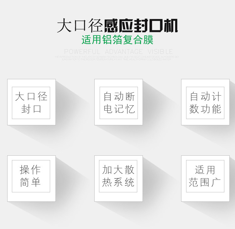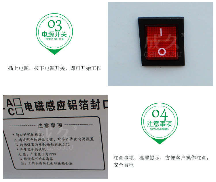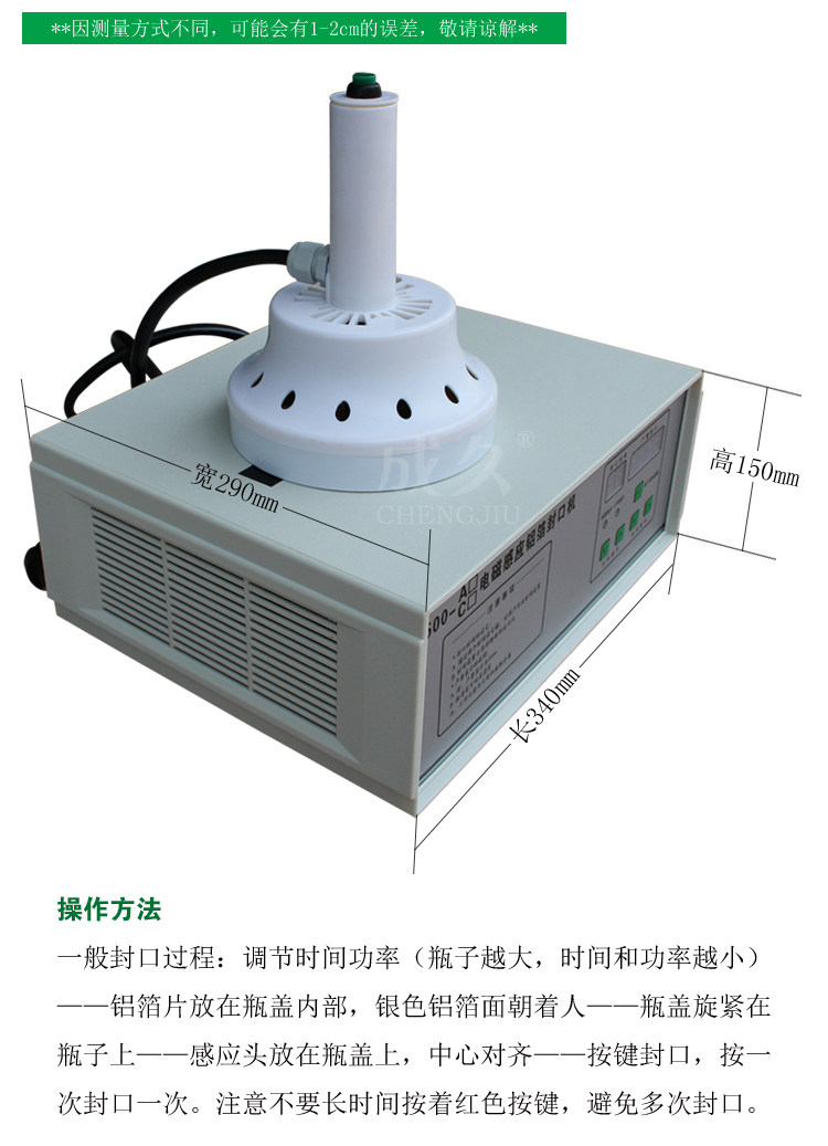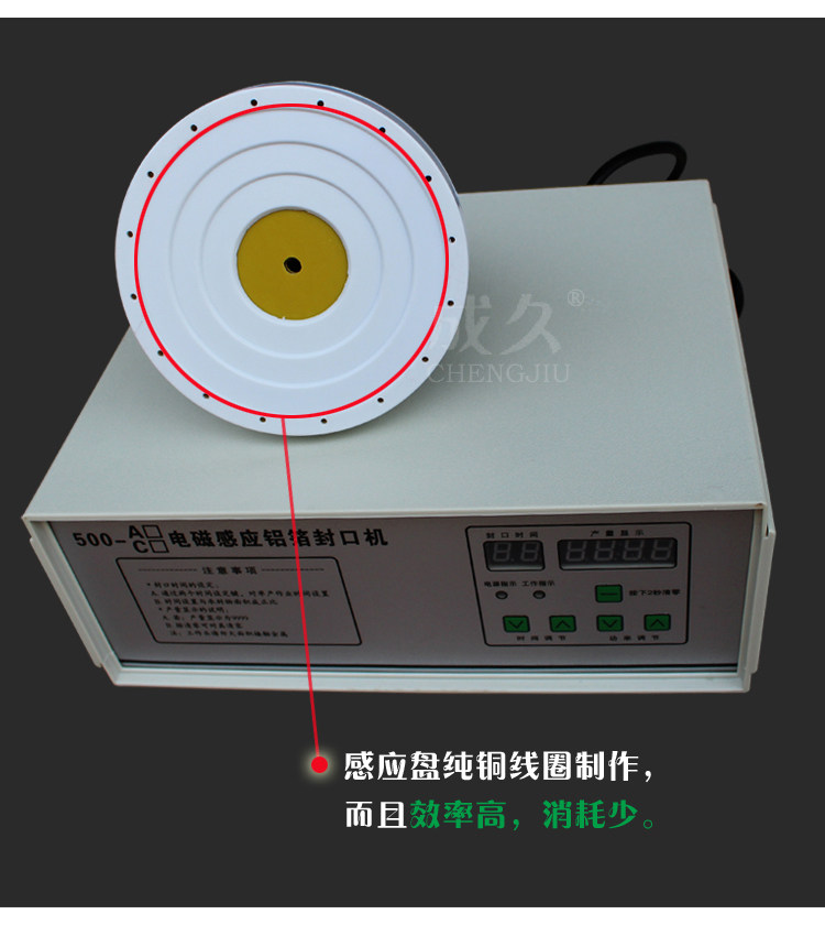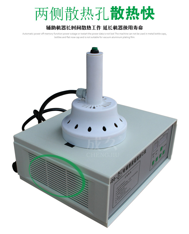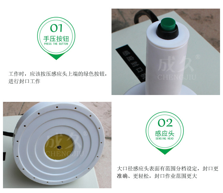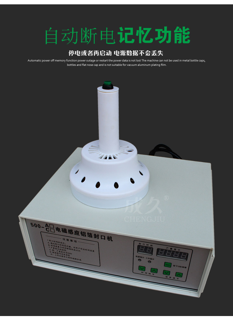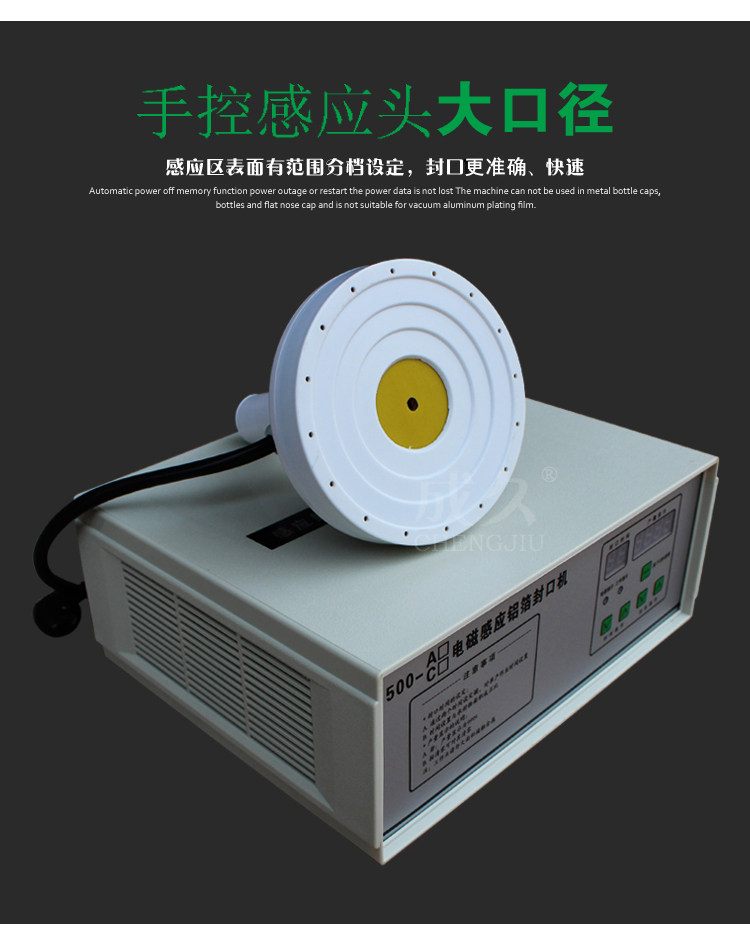 500ZN全智能型手持式微电脑电磁感应铝箔封口机支持智能封口和普通封口两用!智能封口时:瓶子直接放到感应头下面,如果瓶子里有铝箔片,封口机就会工作封口,无需按封口按键,如果没有铝箔片封口机是不会封口的,使用更加方便(目前网络上大部分的封口机都没有这个功能哦)。普通封口时:瓶子放在感应头下,需用手按下感应头上面的按键,机器才会封口。