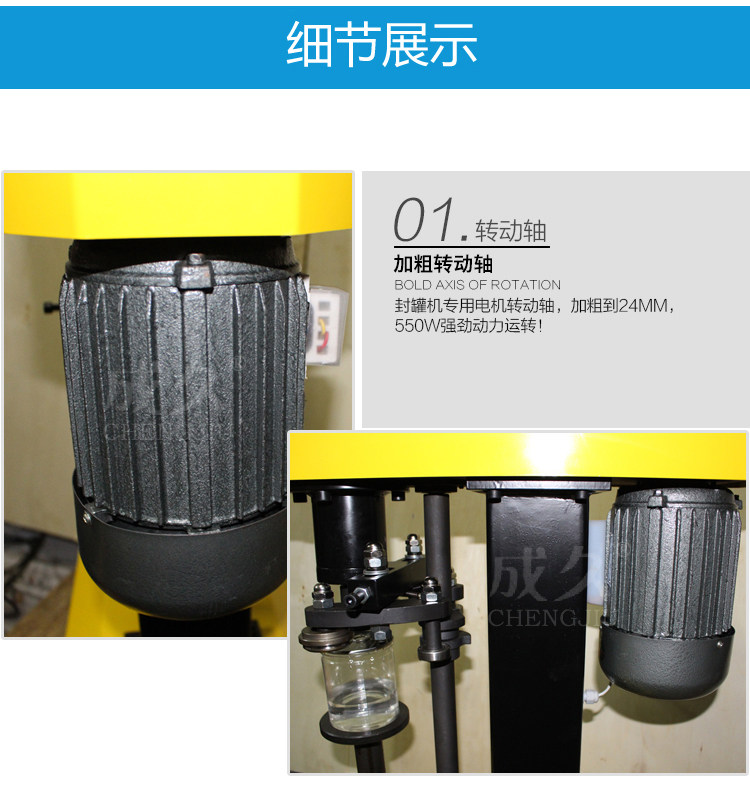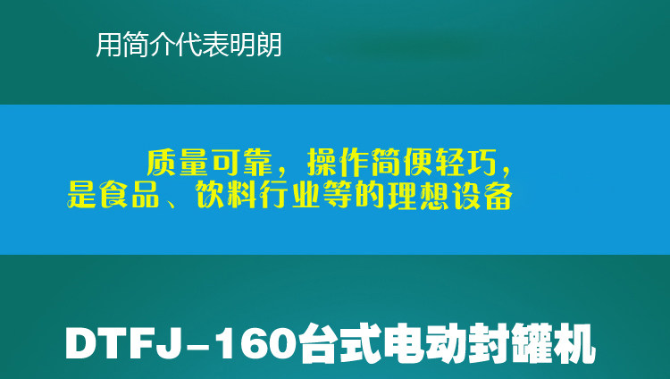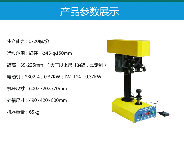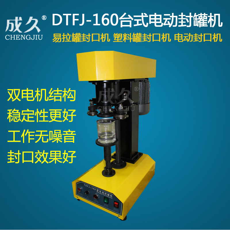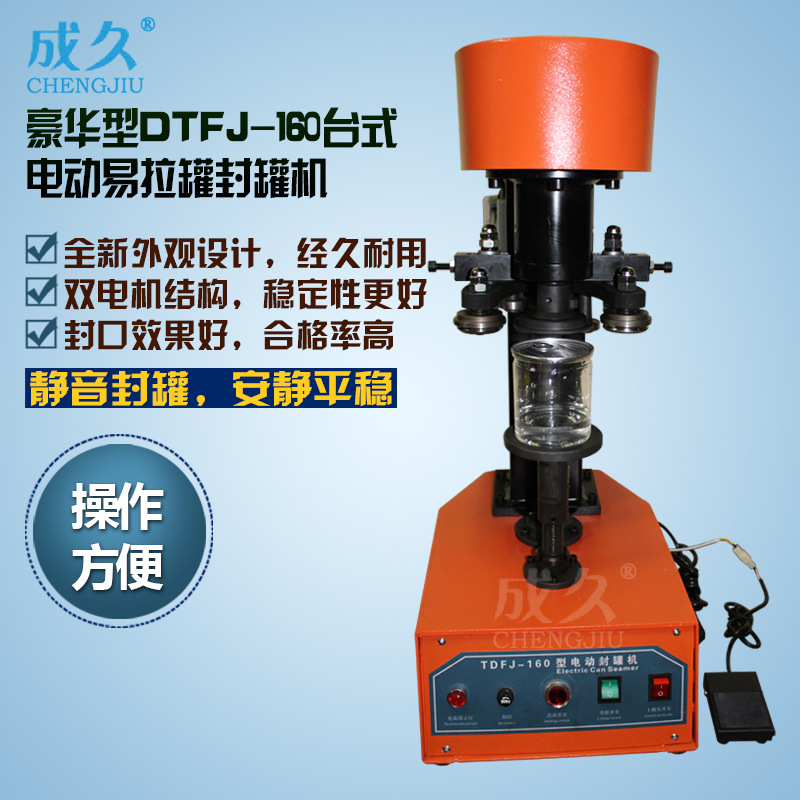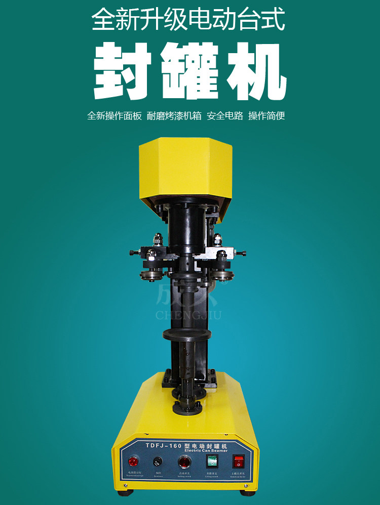 型号:DGT电动易拉罐封罐机适用于各种圆形的铁质、玻璃、塑料、pet易拉罐、铝制易拉罐、纸罐等的马口铁盖、铝盖、易拉盖封口,质量可靠,操作简便轻巧,是食品、饮料行业等的理想设备。更换少量配件即可卷封不同口径的罐子。其卷封处圆滑、无毛刺、不漏水、气。
