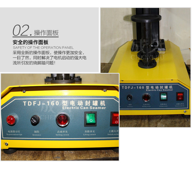 性能特点:罐盖联控装置:当有罐身进入时,才相应配给罐盖,无罐则无盖。“无盖卷封”:当失误没配给罐盖的罐身进入时,也能顺利通过卷封机构,不致罐身咬住压头模以至损坏卷封机构零部件。主机和输送带电机单独无极调速,结构简单,操作维护方便。外罩与主要部件采用304不锈钢,满足食品药品卫生要求。