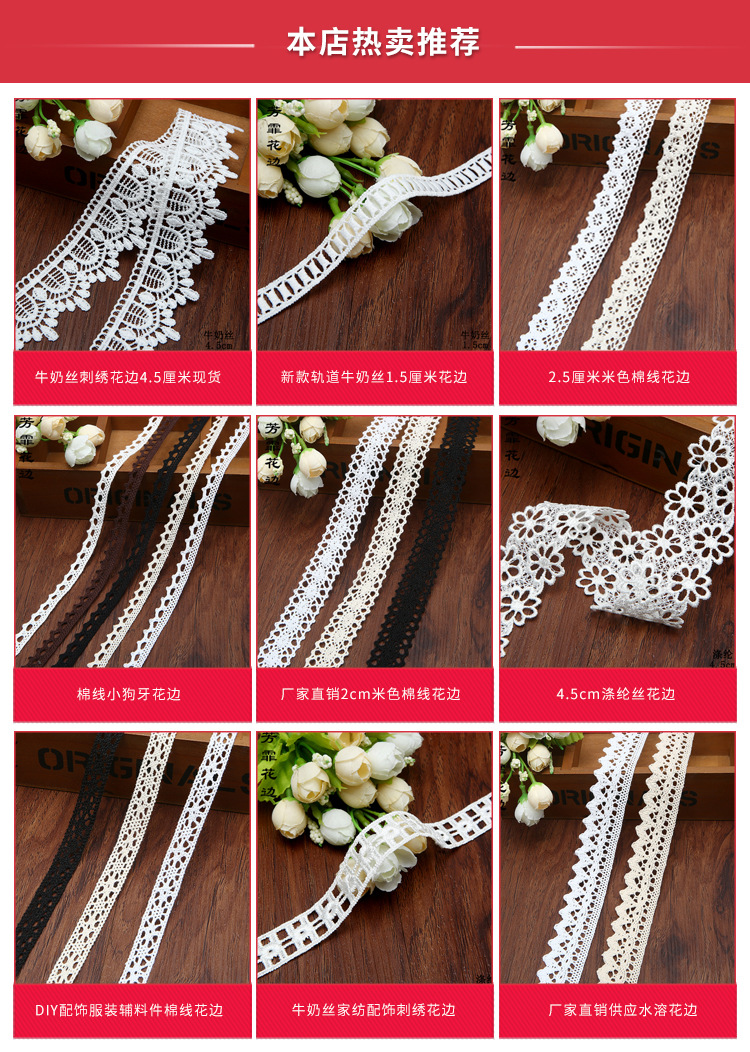 3.关于色差:由于灯光、显示器等原因,花边图片与实物也许有稍微色差,