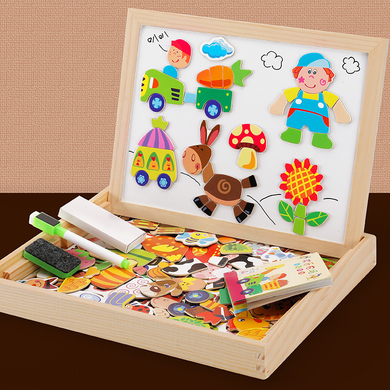 淘宝爆款,底价供应!配备一盒粉笔、一只水笔,分别可以在玩具配备的双面磁性黑白板上面写字画画。木盒本身就是一个收纳储存盒,精妙的设计使得黑白板能够非常简易地翻起并倾斜一定角度固定在盒子上。玩具能让孩子认识形状和颜色,培养孩子的空间思维能力,锻炼孩子的想象力,充分发挥孩子的创造力。家长可在一旁协助或亲子同玩,增进亲子之间的情感交流,磁性拼图由贴纸+木板+磁性材料构成,切勿水洗。