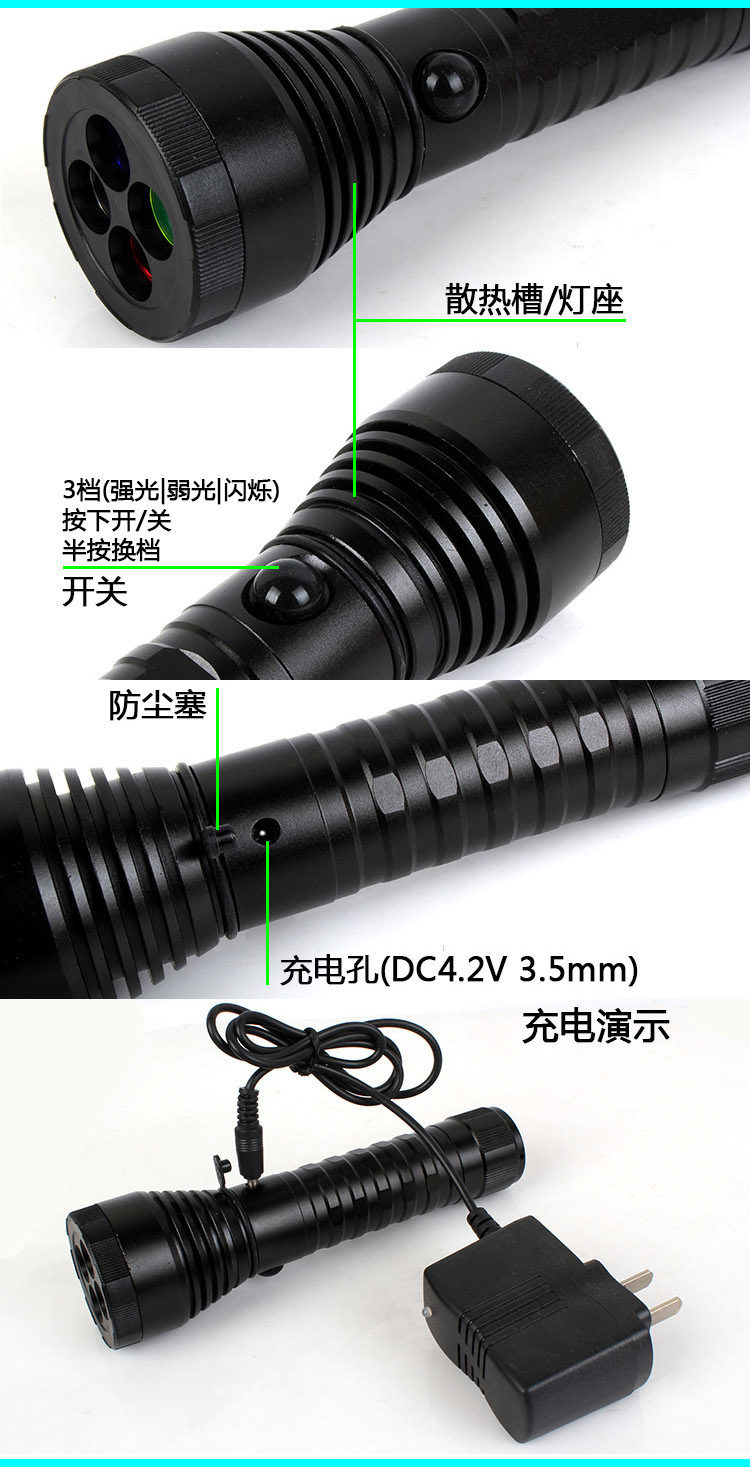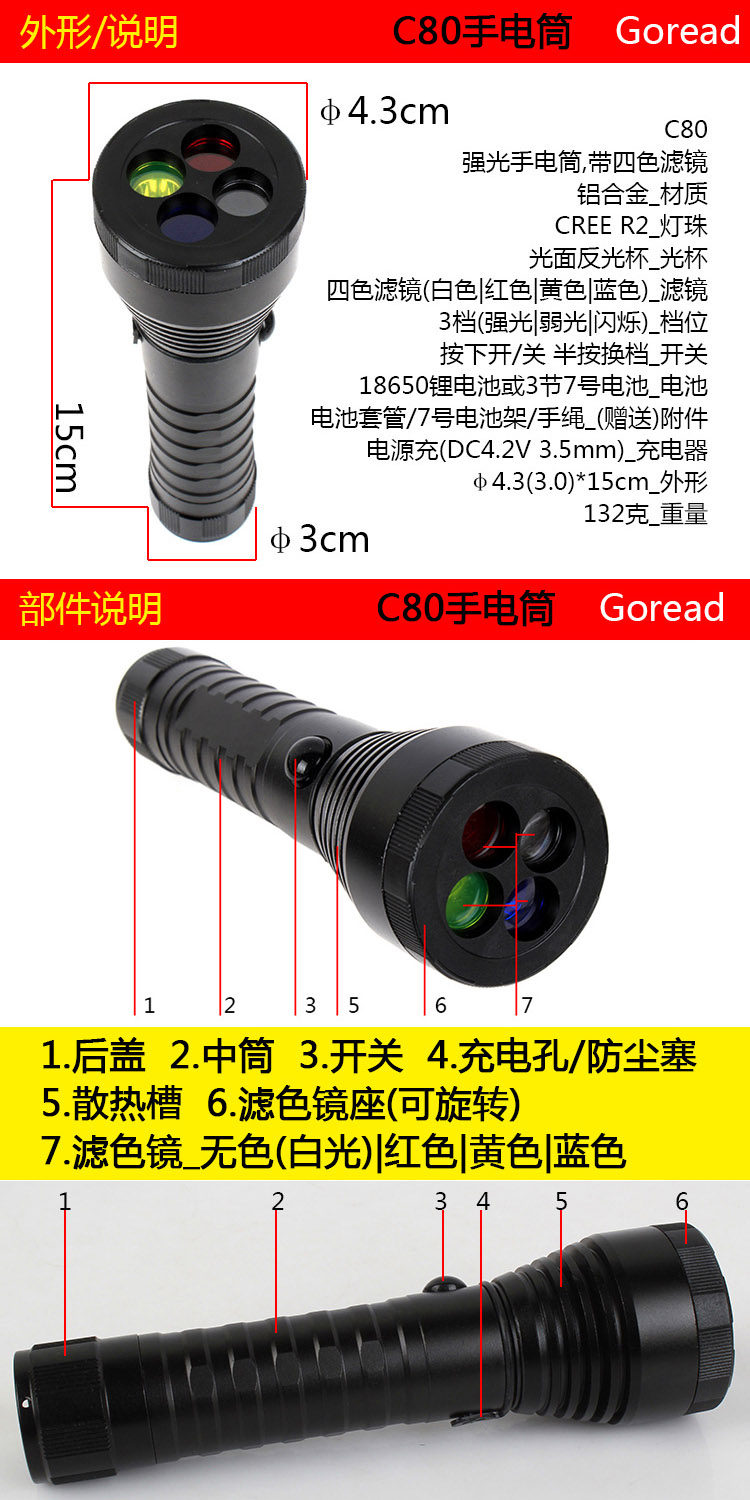 C80 신호 램프 작업 빛 LED 손전등 충전식 손전등 4 색 광원 LED 조명