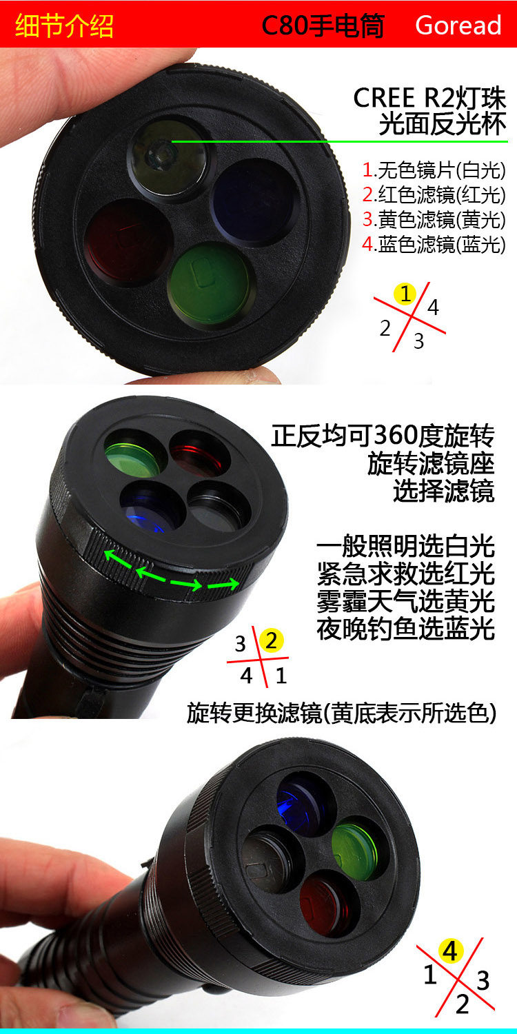 镜片:四色滤镜(白色|红色|黄色|蓝色)旋转换色