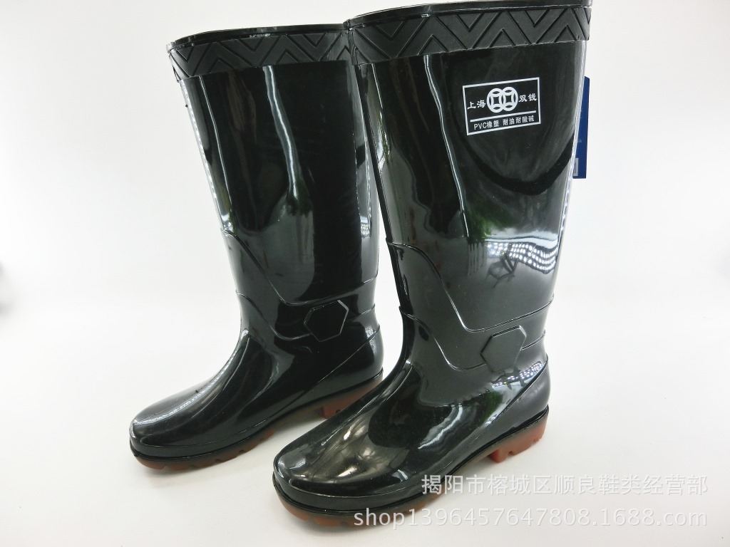 공장 직접 판매 상하이 남성용 더블 머니 레인 부츠 99-2 블랙 더블 천 하이 튜브 PVC 레인 부츠 미끄럼 방지 힘줄 바닥 노동 보호 신발스토어 가기