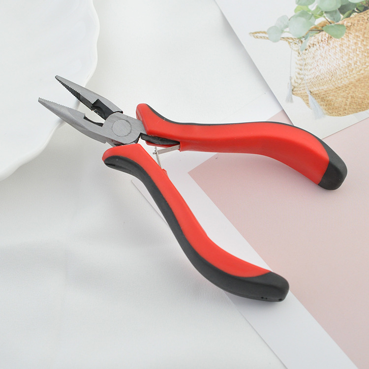 尖嘴钳:可以用来夹扁定位珠,把弯了线或者针弄直,掰开合并单圈等,分有牙齿和无牙齿,无牙齿多用于夹金属配件时不留下痕迹。