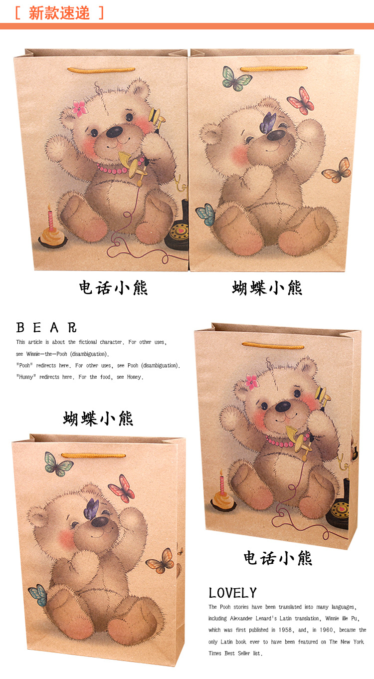 만화 인쇄 곰 선물 가방 오픈 크래프트 종이 포장 가방 선물 상자 의류 가방 어린이 날 핸드백 재고 있음