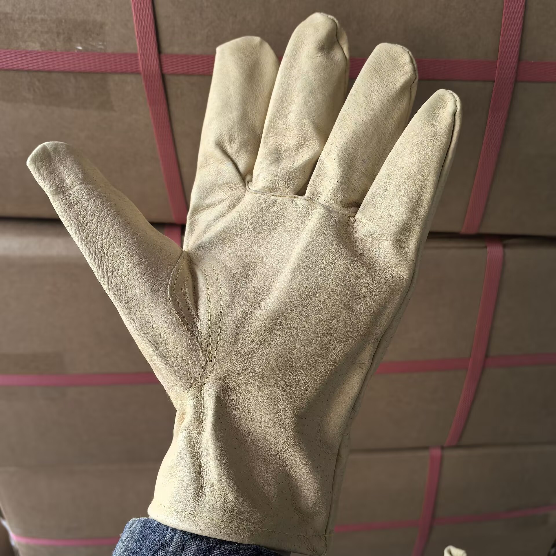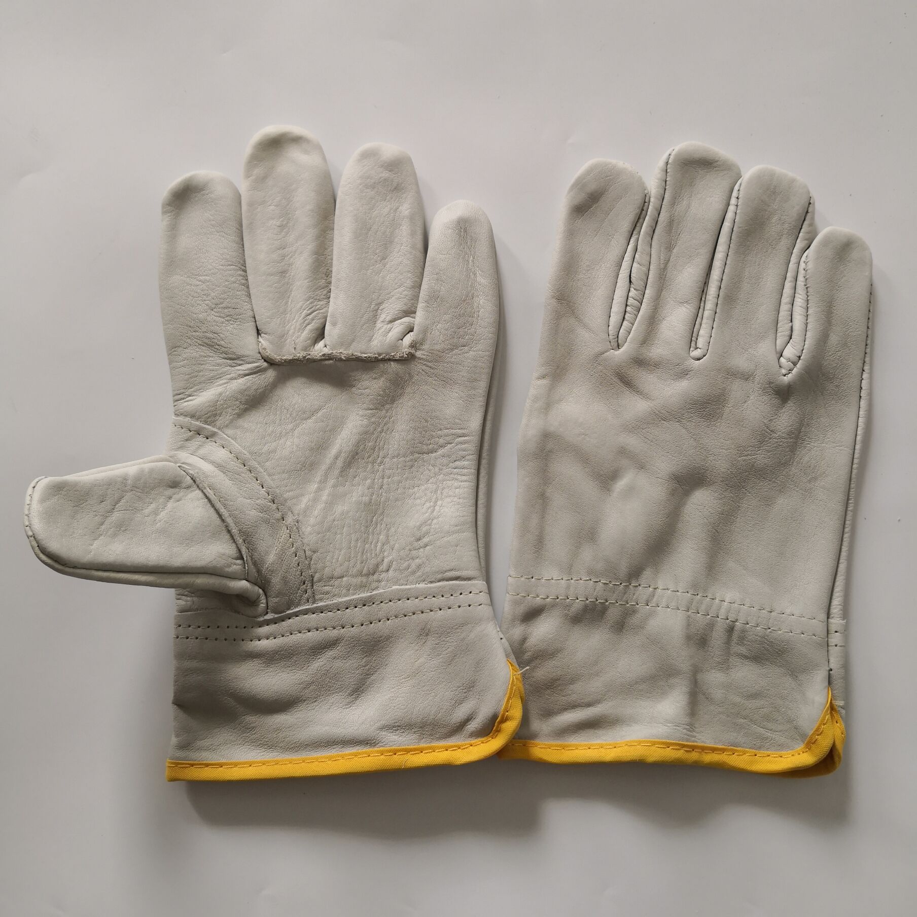 热销款:软牛头层统一色虎口加强型,在易开口的虎口位置增加一层头层皮托面,适合各类工种,耐用度增加数倍,是钣金、电焊、搬运等工作的最佳选择!图二为客户使用反馈发来的相片。