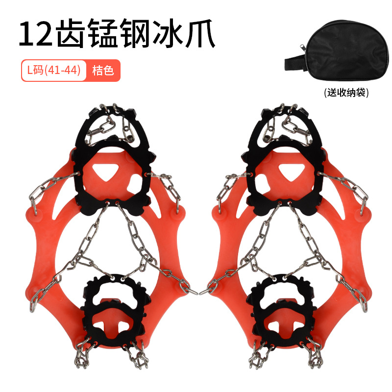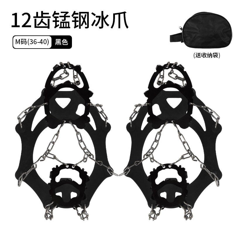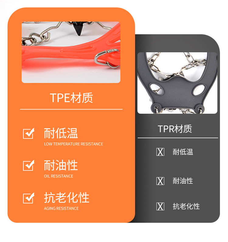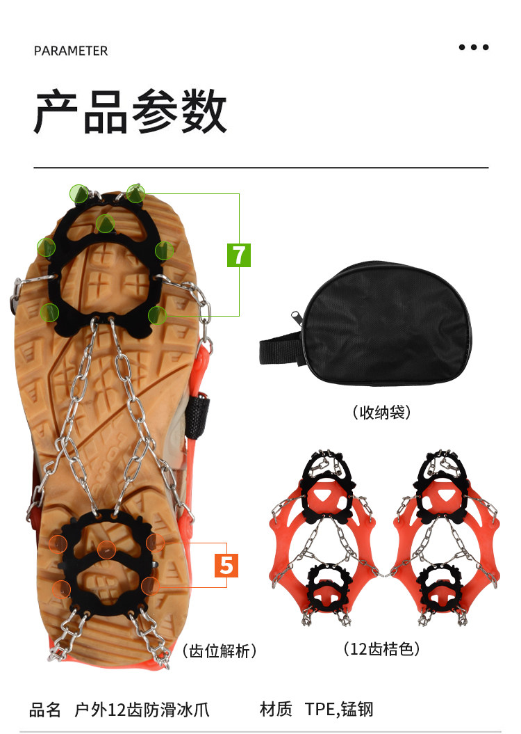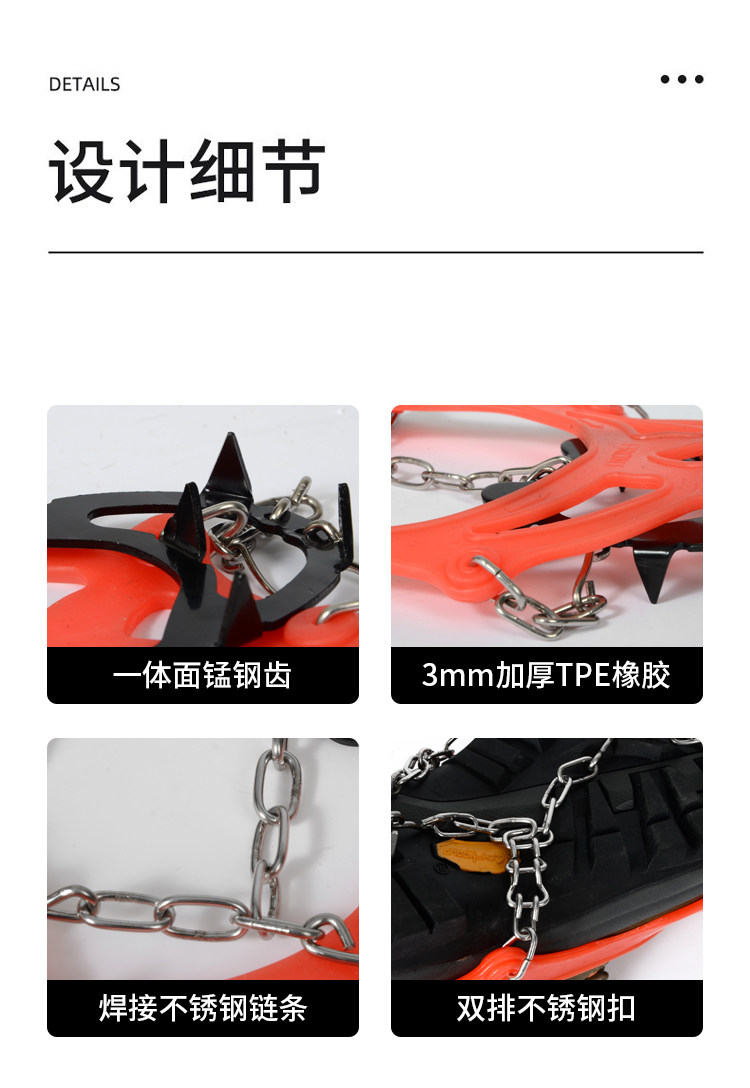 冰齿采用高强度锰钢材质,每个冰齿的长度均达到1.2cm,可有效插入泥雪草地等复杂地中,防止打滑(而普通短齿冰爪或橡胶齿的冰爪 抓地性欠佳),链条同样采用高强度的不锈钢材质,不会生锈,不易断裂。