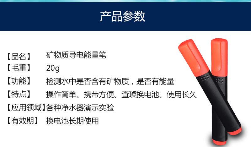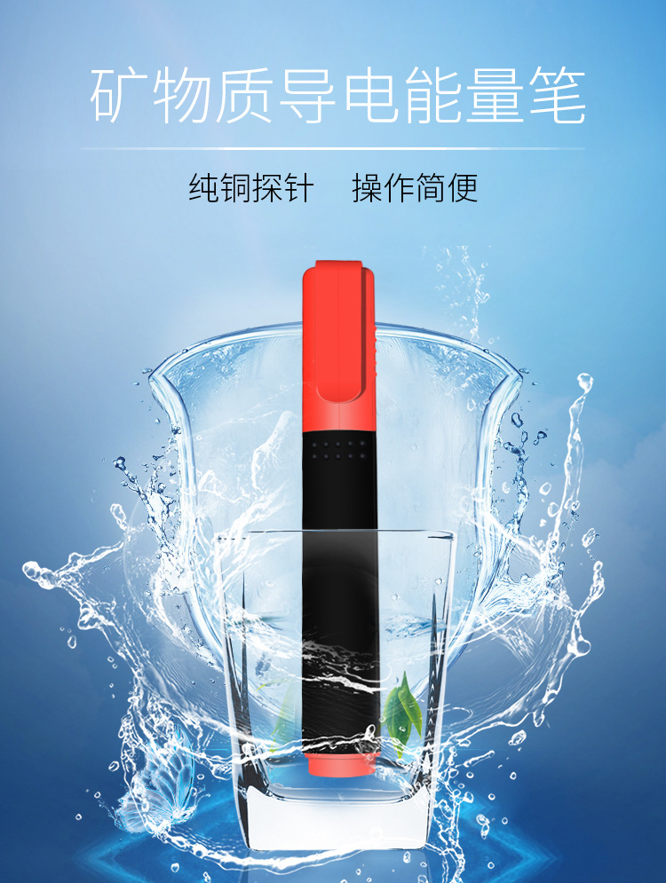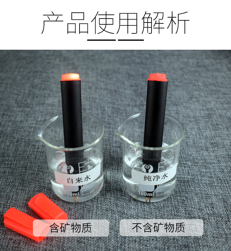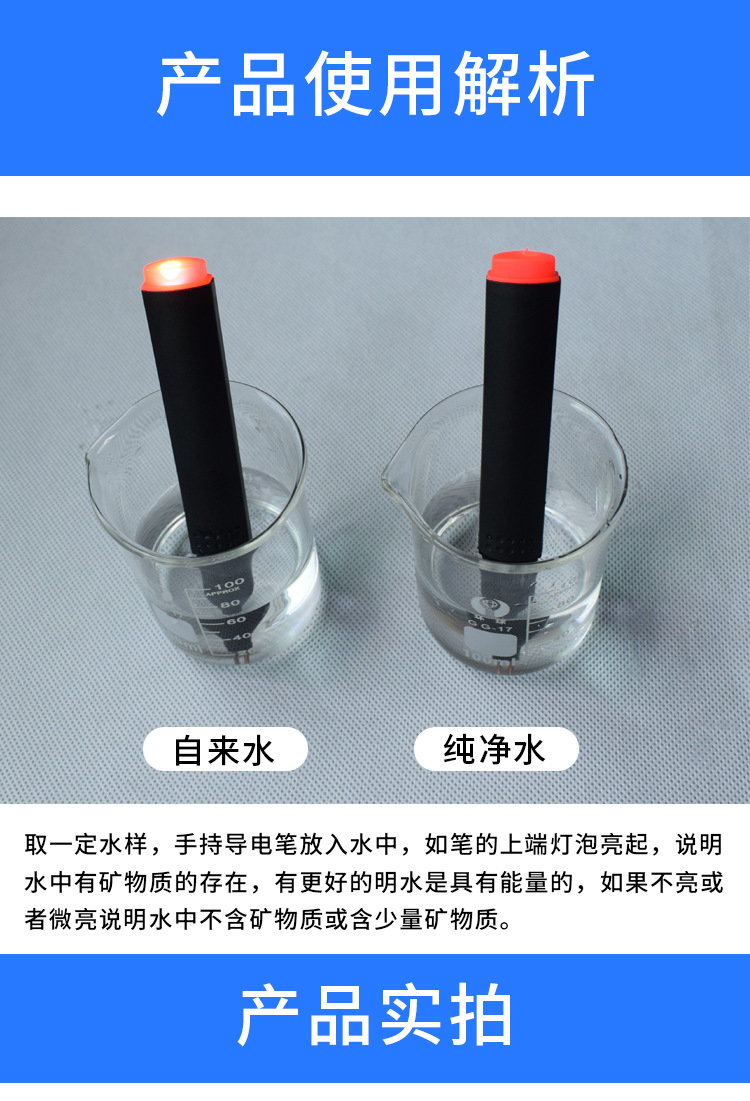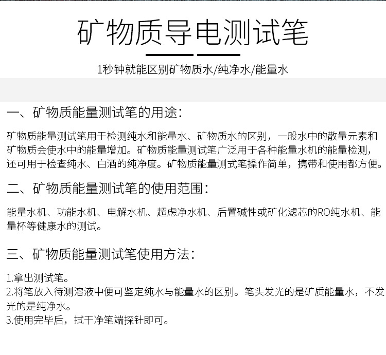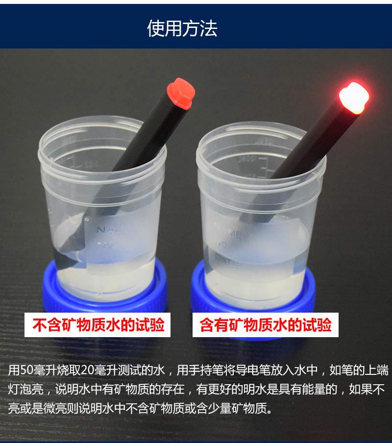 用法:倒半杯水,将能量笔打开盖子,将笔尖放入水中,如果亮灯表示水中含有矿物质,如果不亮灯,表示水中不含矿物质。
