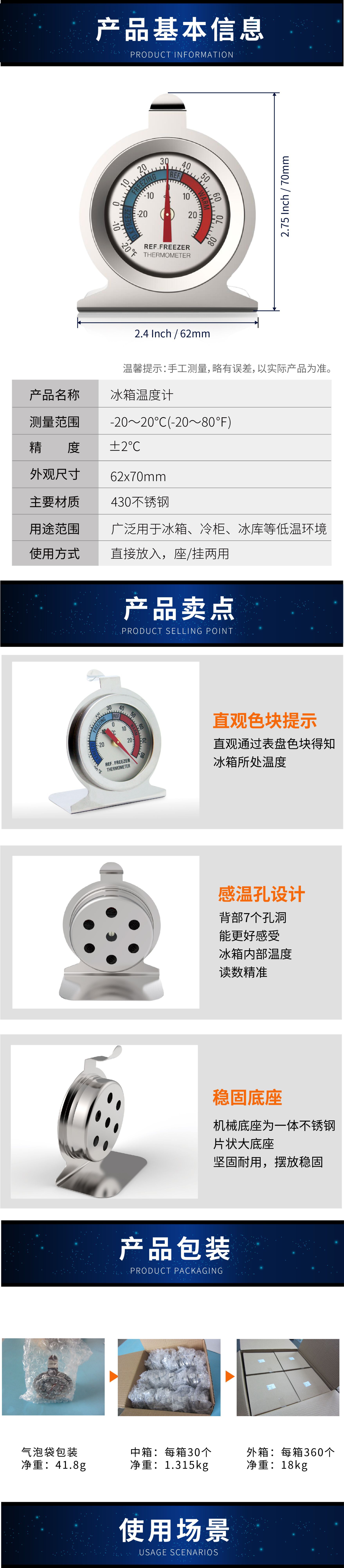 • 📏 2英寸双刻度清晰表盘:读数直观,蓝区/红区清晰标示冷冻/常温区间,便于判断是否达标。