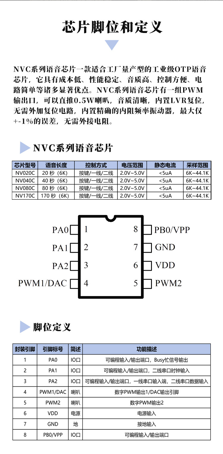 9코어 전자 음성 칩, 음악 재생 칩, IC 초인종 칩, OTP 직접 출력 0.5W 스피커, NVC 시리즈