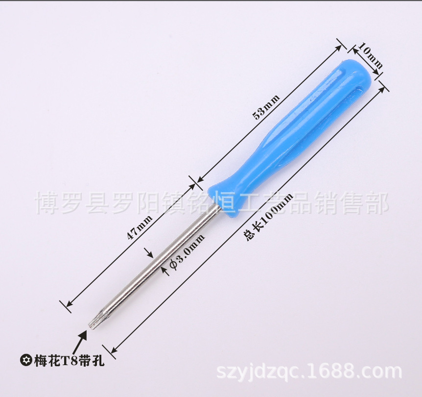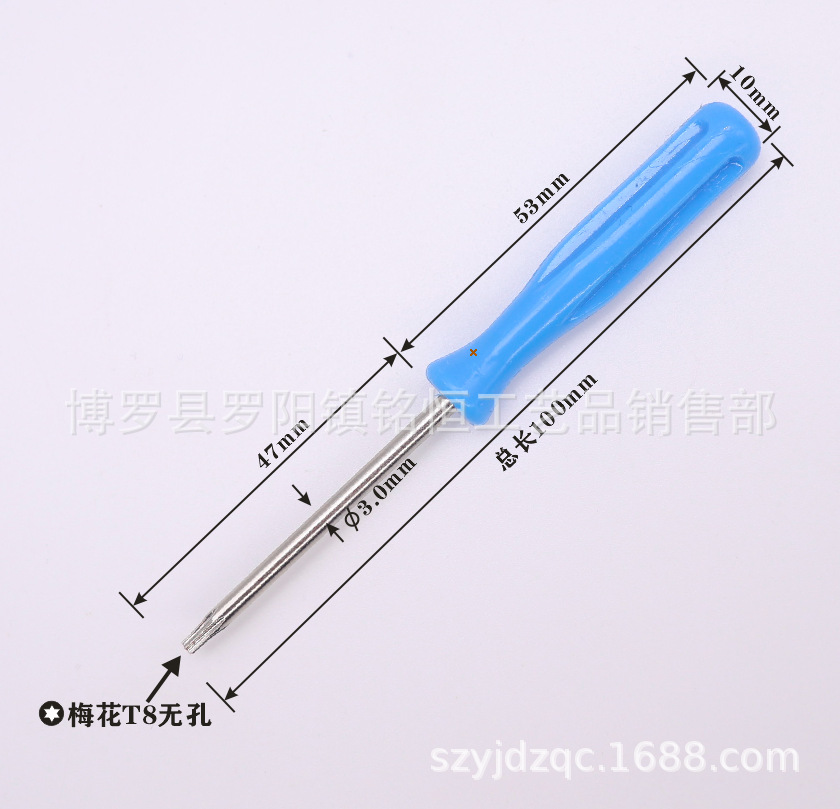 此款产品总长100MM*五金刀杆直径3MM刀头为梅花(T4/T5/T6/T8/T10)*塑胶刀柄直径10MM/塑胶柄长54mm五金刀杆.可根据客人要求更换不同型号刀杆.如:十字/一字/米字/梅花/五星/带孔梅花等.质量保证,交货及时,欢迎前来选购!洽谈。