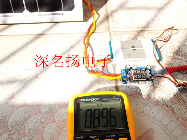 MPPT不起作用时的充电电流0.896A, (光线比较强,相机快门比较快,表头上数字在拍照片时显示会不QUAN,懂点摄影的朋友应该都明白。)