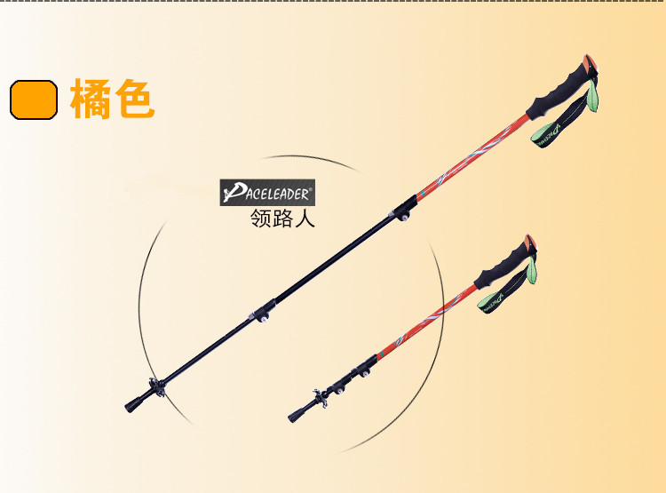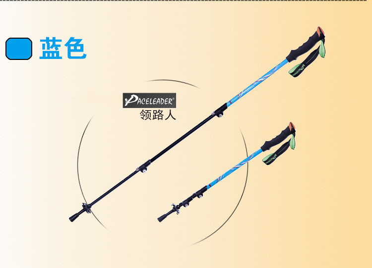 手持登山杖站在平面上,先将登山杖全部旋松,手臂自然下垂,以手肘为支点,将前臂抬起到跟上臂成90度,最后将登山杖的支杆全部锁紧。调整时不应该超过登山杖上所显示的最大调整长度;