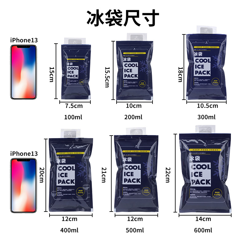 此款图中400ml规格12*20,200ML规格10*16,100ml规格10*12.另外本店还销售其他大小的冰袋,欢迎进店采购哦!