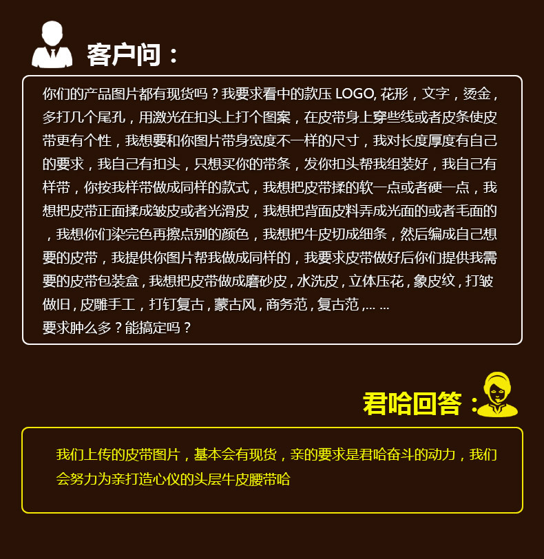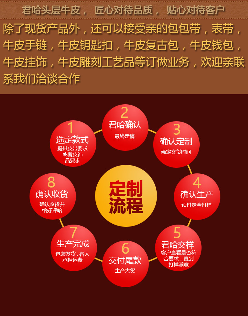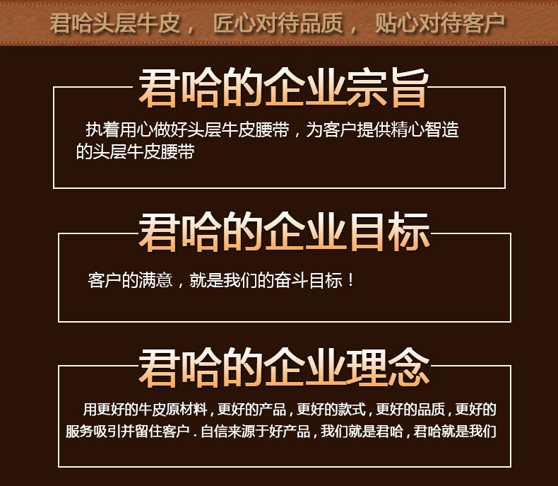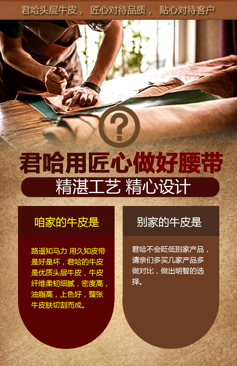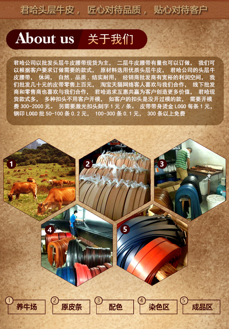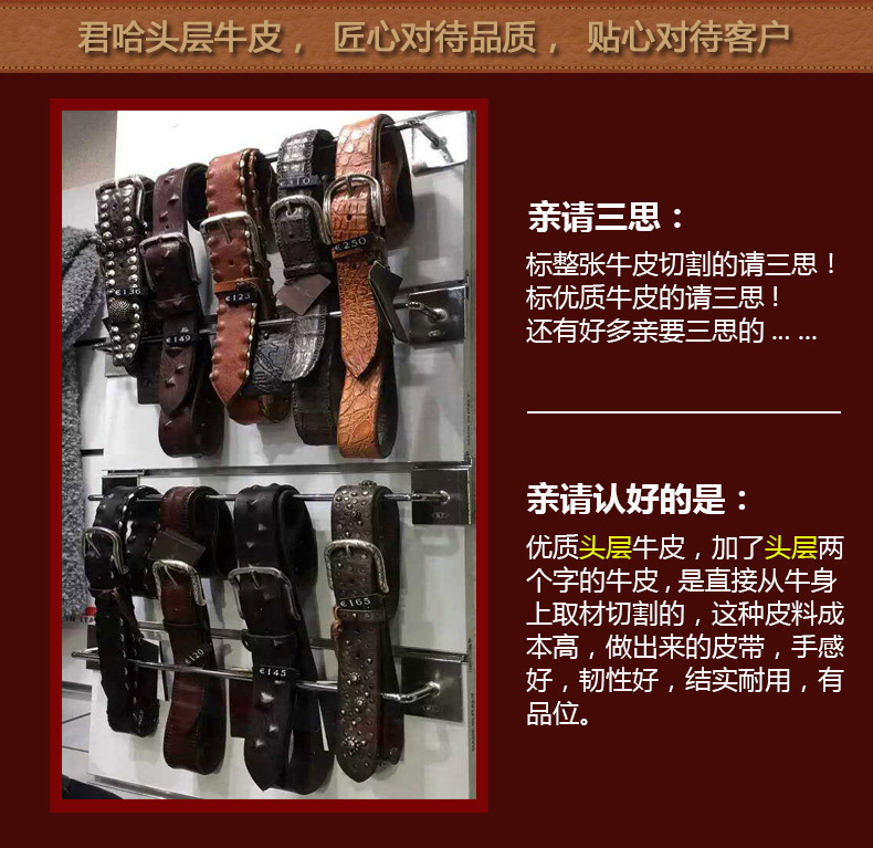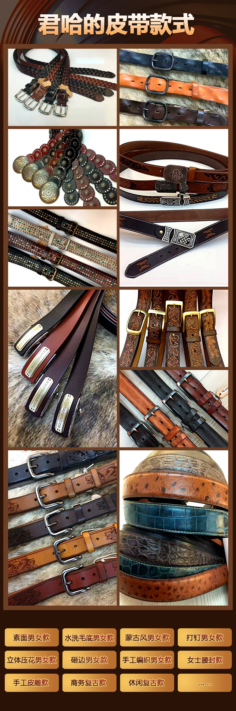 爱皮草,爱君哈,头层牛皮腰带现货款式多,新款多,专注皮带批发和皮带订做,喜欢和批发商,品牌商,网络经销商合作,零买的亲绕道,爱皮草爱牛皮腰带的亲多关注君哈。批现货的请注明颜色各多少条。如果亲想订做我们没有的靓带,请把产品图片或样带及要求发君哈,君哈为亲打造心仪的头层牛皮腰带哈,欢迎咨询订购。