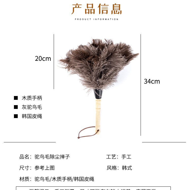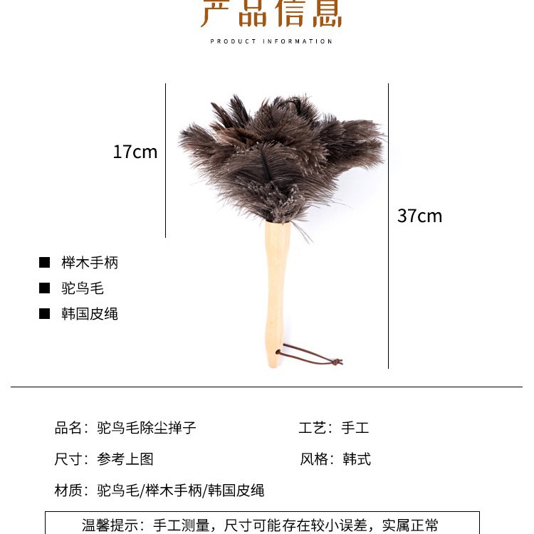 品名:鸵鸟毛掸子 规格:全才约厘米,木柄厘米(手工制品每款有差距) 材质:进口鸵鸟毛,实木手柄,真皮挂绳 工艺:纯手工制作 主要用途:汽车、高档家具、电脑、精密仪器、瓷器古董等 使用保养:温水轻轻揉洗,晾干或吹干,羽毛更加蓬松 温馨提示:鸵鸟毛有少许味道,请打开包装晾晒几天,羽毛会自然蓬松展开。手工产品会有绒毛和碎片掉落是正常现象,用几 次就好。