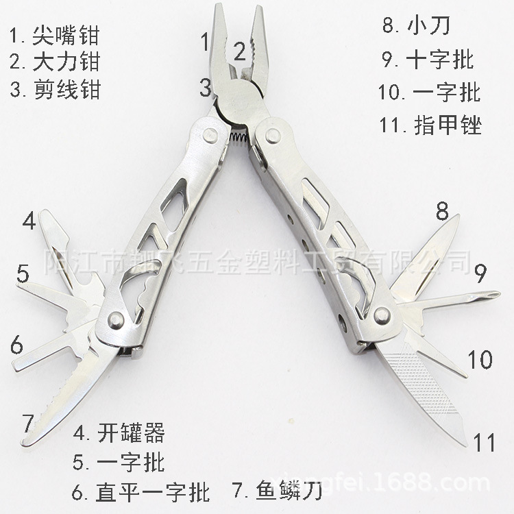 尖嘴钳,剪线钳,大力钳,小刀,十字批,一字批,鱼鳞刀等等功能。