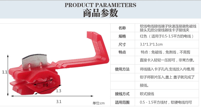 产品规格:适用线径0.5-1mm2 颜色为红色