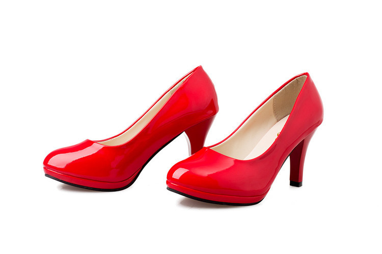 봄과 가을 새로운 전문 에나멜 가죽 얕은 입 라운드 발가락 얇은 뒤꿈치 방수 테이블 슈퍼 미드 힐 5cm 싱글 신발 사계절 여성 신발스토어 가기