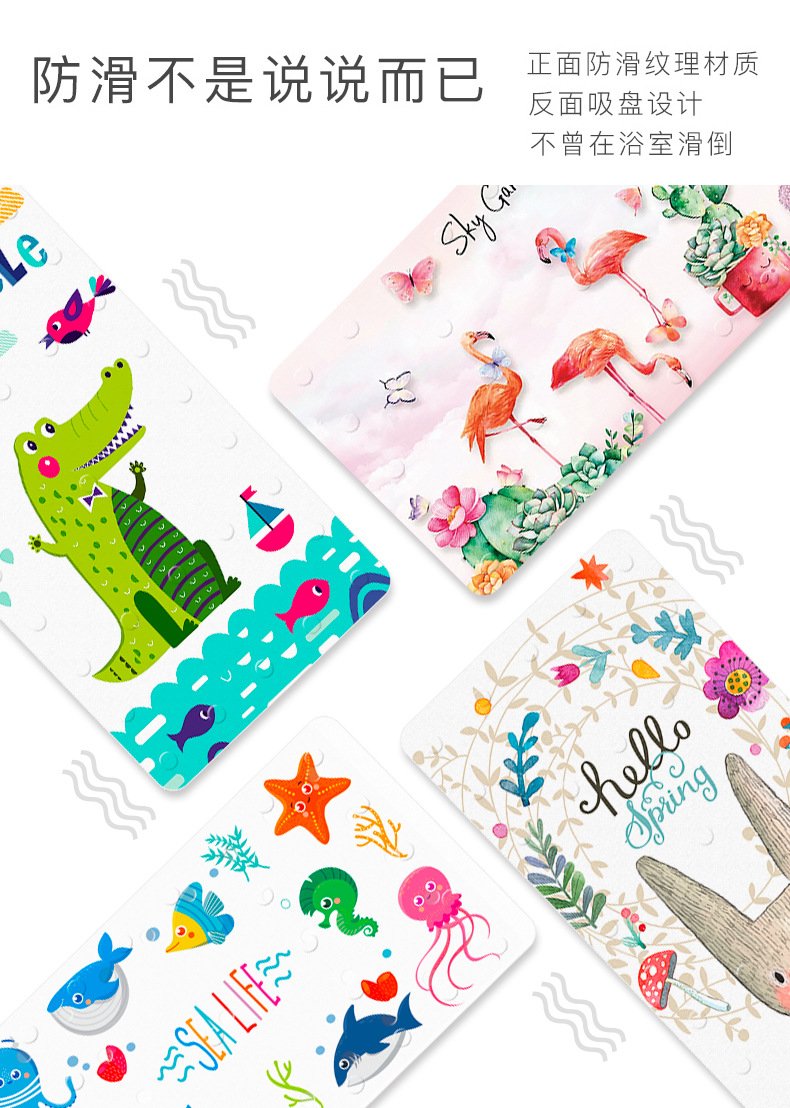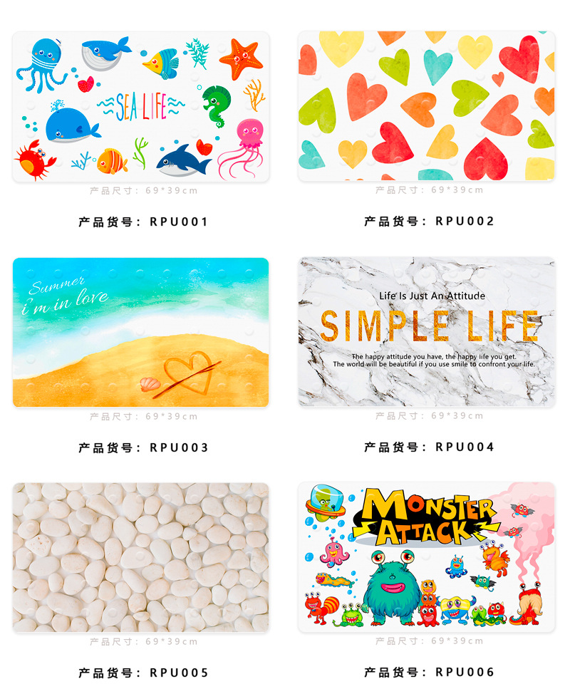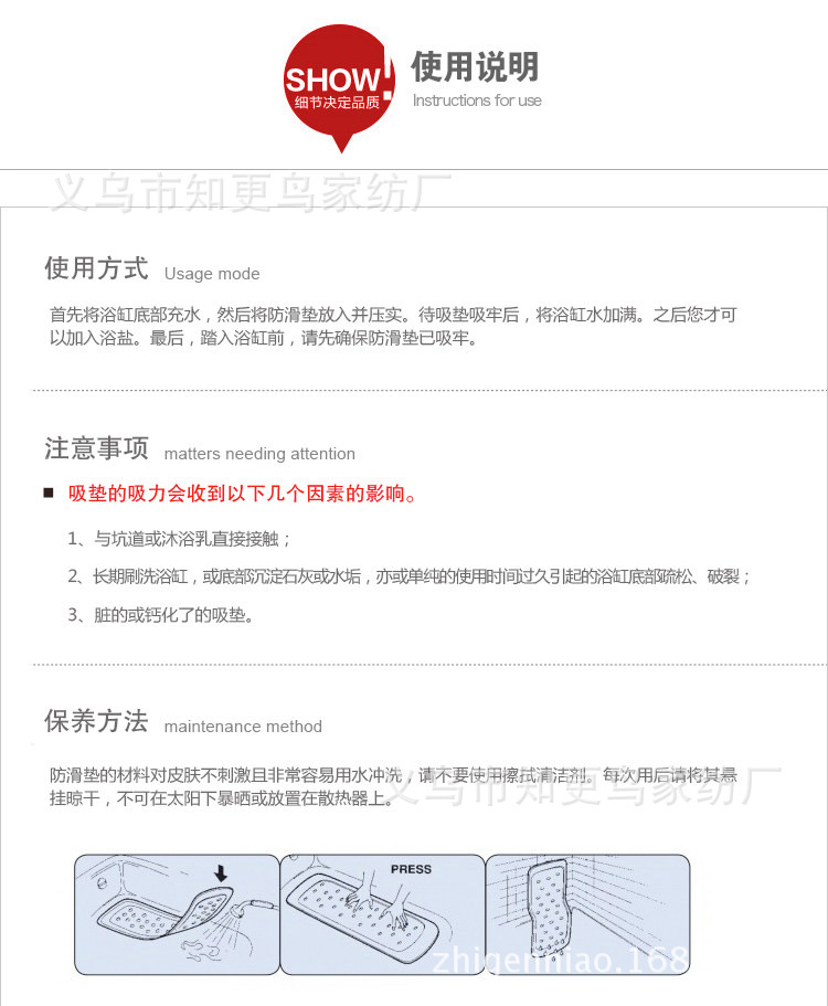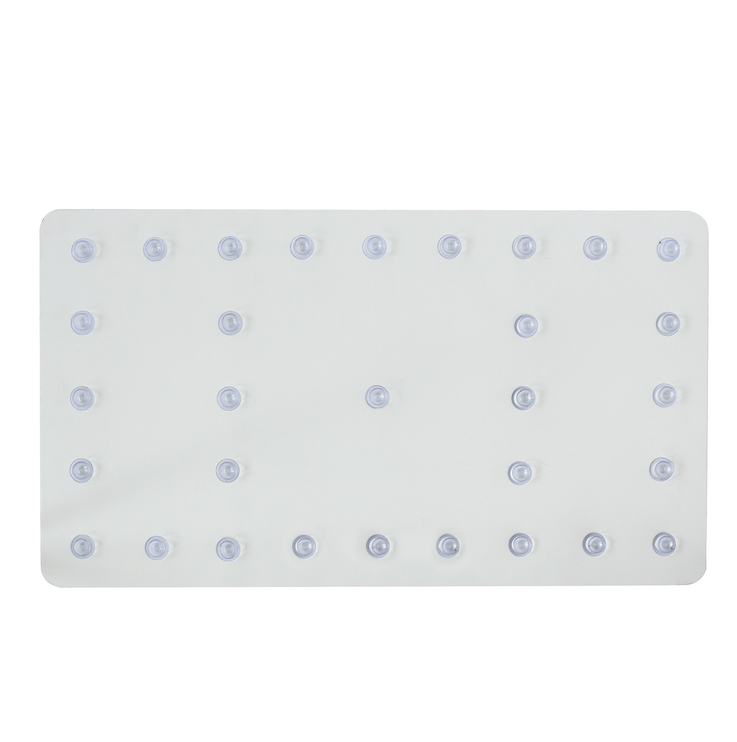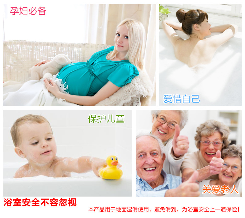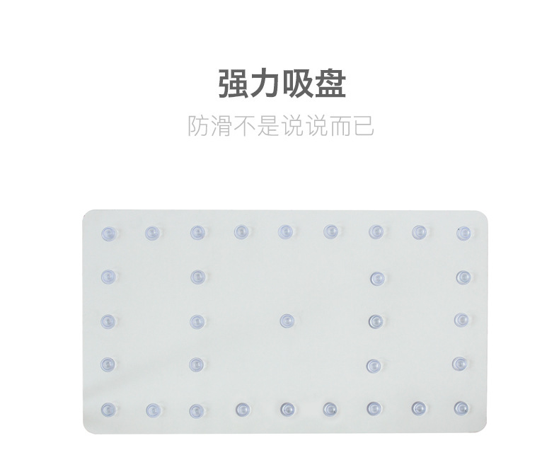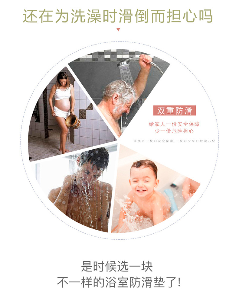 使用方法及安全提示:多个吸盘,使用前请先将地面用湿拖把拖净(防滑垫吸盘在湿地面砖上容易吸住),或者给地面洒水再把防滑垫铺在地砖上,最好再站上去踩几下,就与地面贴住浴室的光滑地面可是容易被忽略的安全"杀手",一旦有蒸汽、水滴或空气返潮现象,一不小心就会滑倒,突发危险事故,有了这款防滑垫就能提升浴室活动的安全性