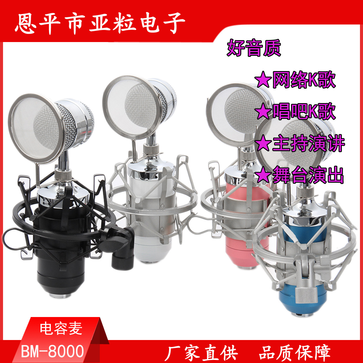 BM-8000电容麦克风由亚粒电子厂生产,厂家直销,拒绝爆利,平民价格,让你工作之余享受音乐带给你的快乐。