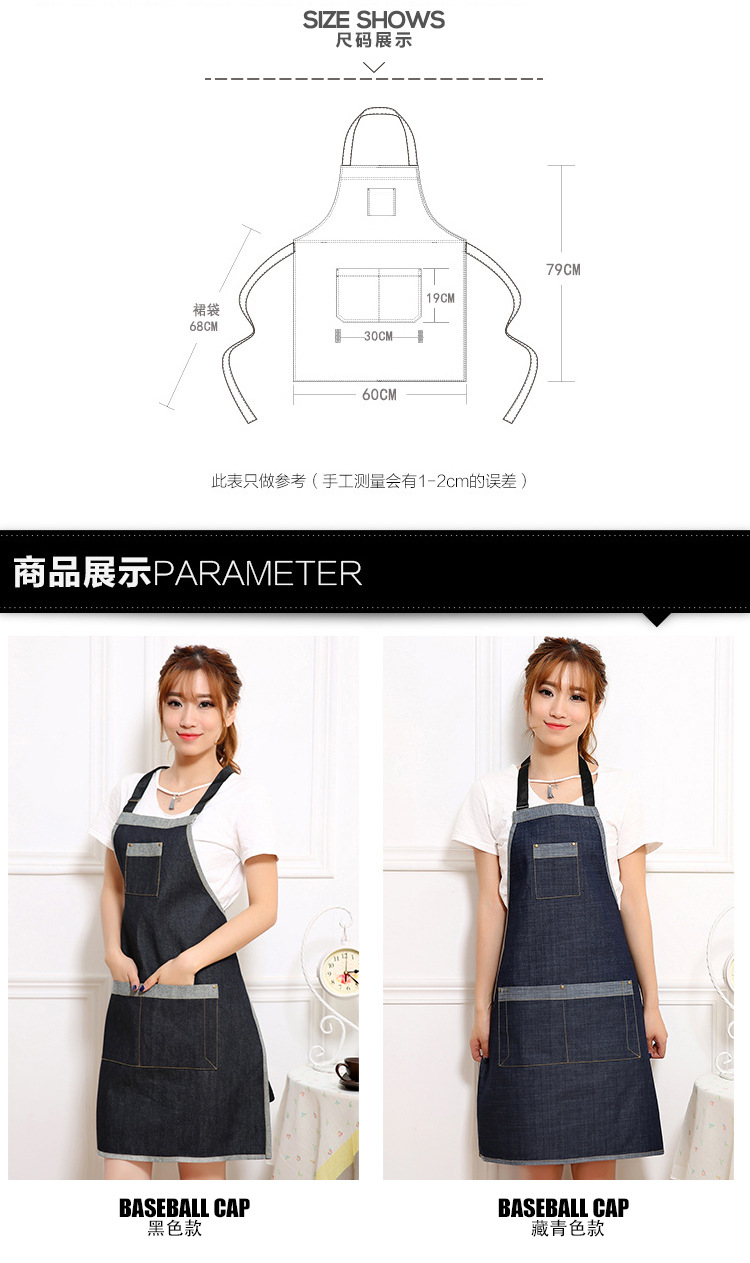 여름 간단한 데님 앞치마 사용자 정의 목 교수형 작업복 노동 보호 참석자 광고 앞치마 사용자 정의 로고