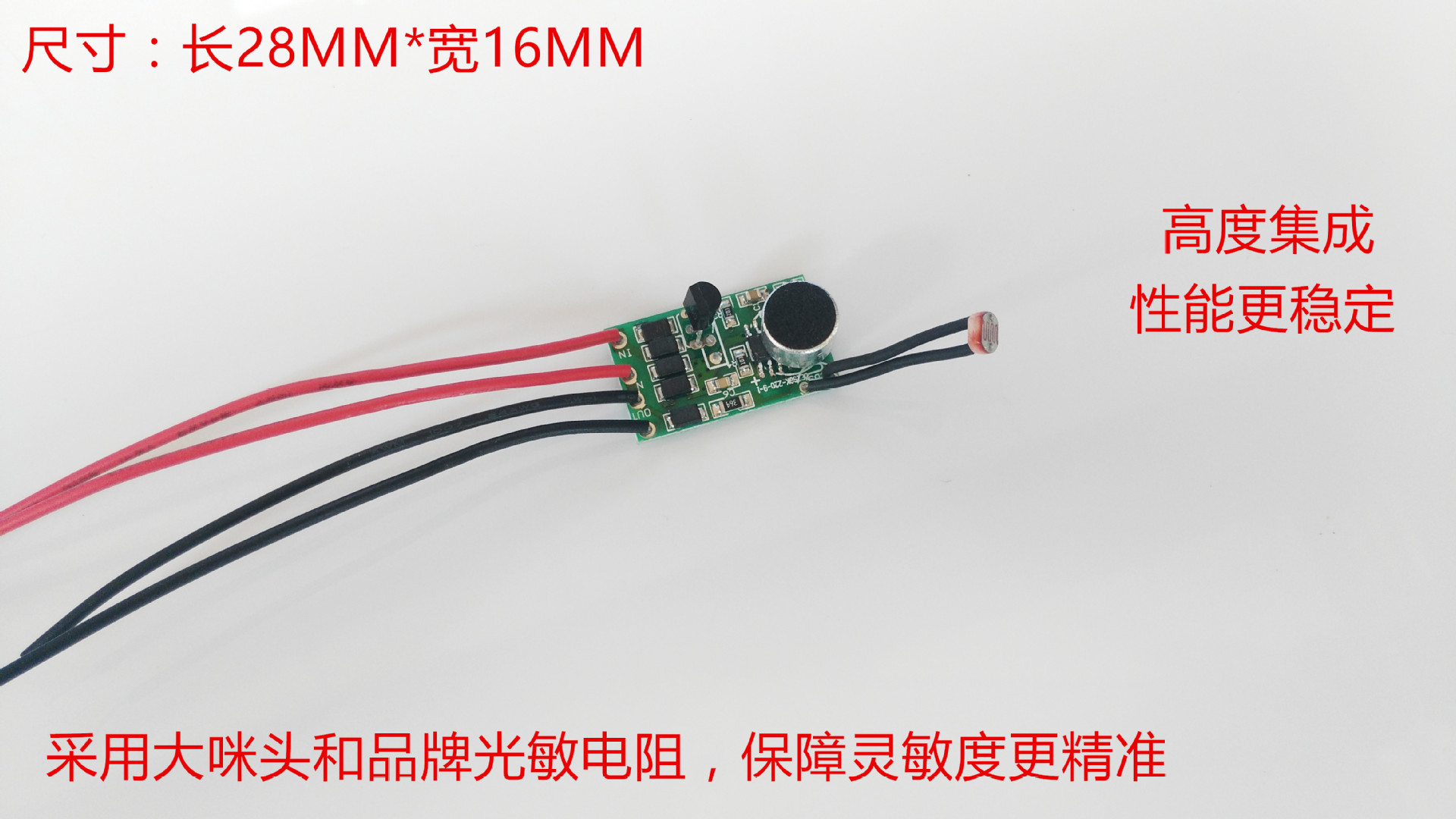 产品在白天不工作,晚上有声音才工作,感应距离8-10米。工作45秒作用自动关掉,直到再次有声音激活。非常灵敏。(也可以做成全天有声音都工作)