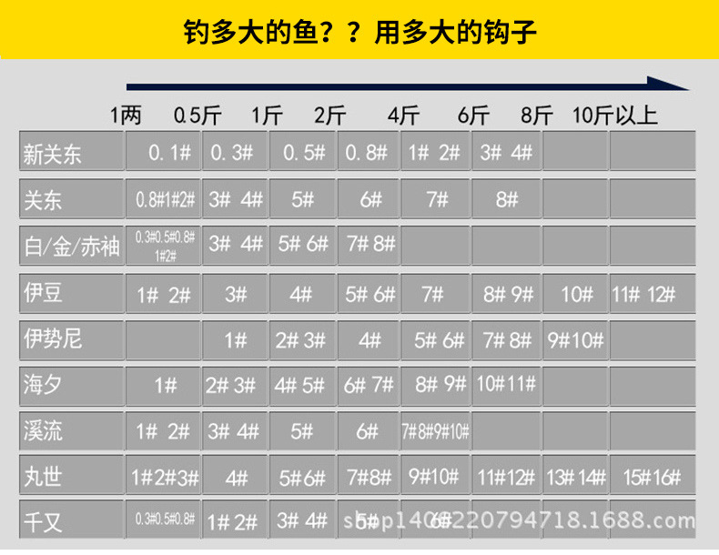 在鱼塘,沟汊钓鲫鱼,鳊鱼等小型鱼类,应选用小号袖型和园口型居多,型号有4-7号,伊势尼3-5号,千又0.8-1号。竞技钓选择关东5-8号,伊豆5-8号。在挑选钓钩时,可用钩尖在
